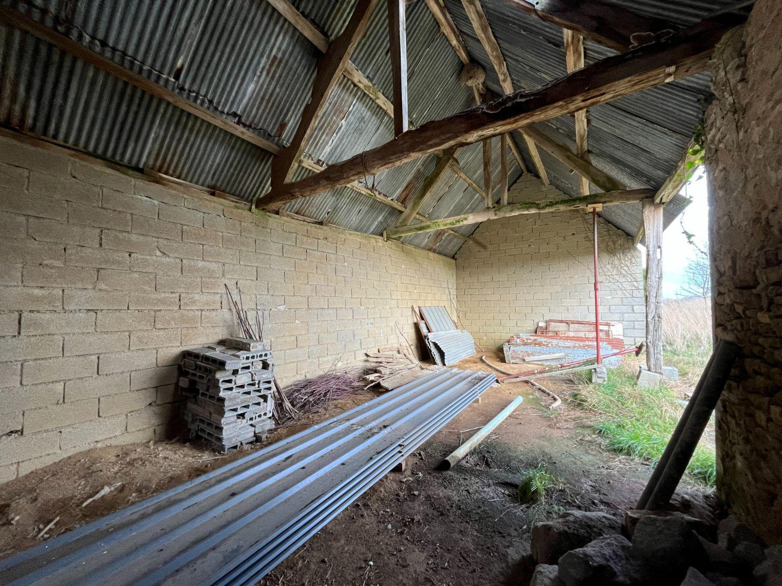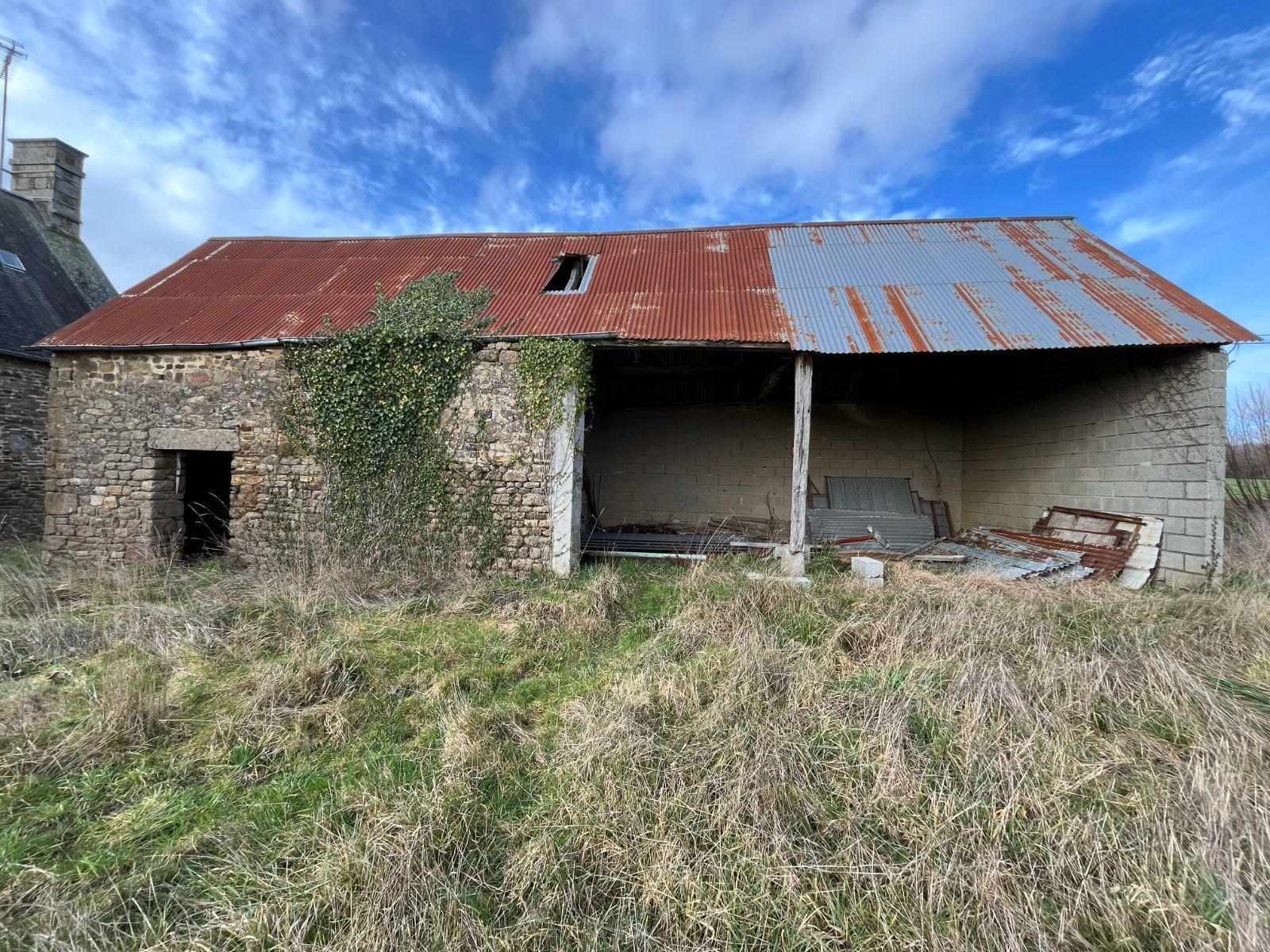Hangar couvert en tôle sur l'arrière et jardin autour.