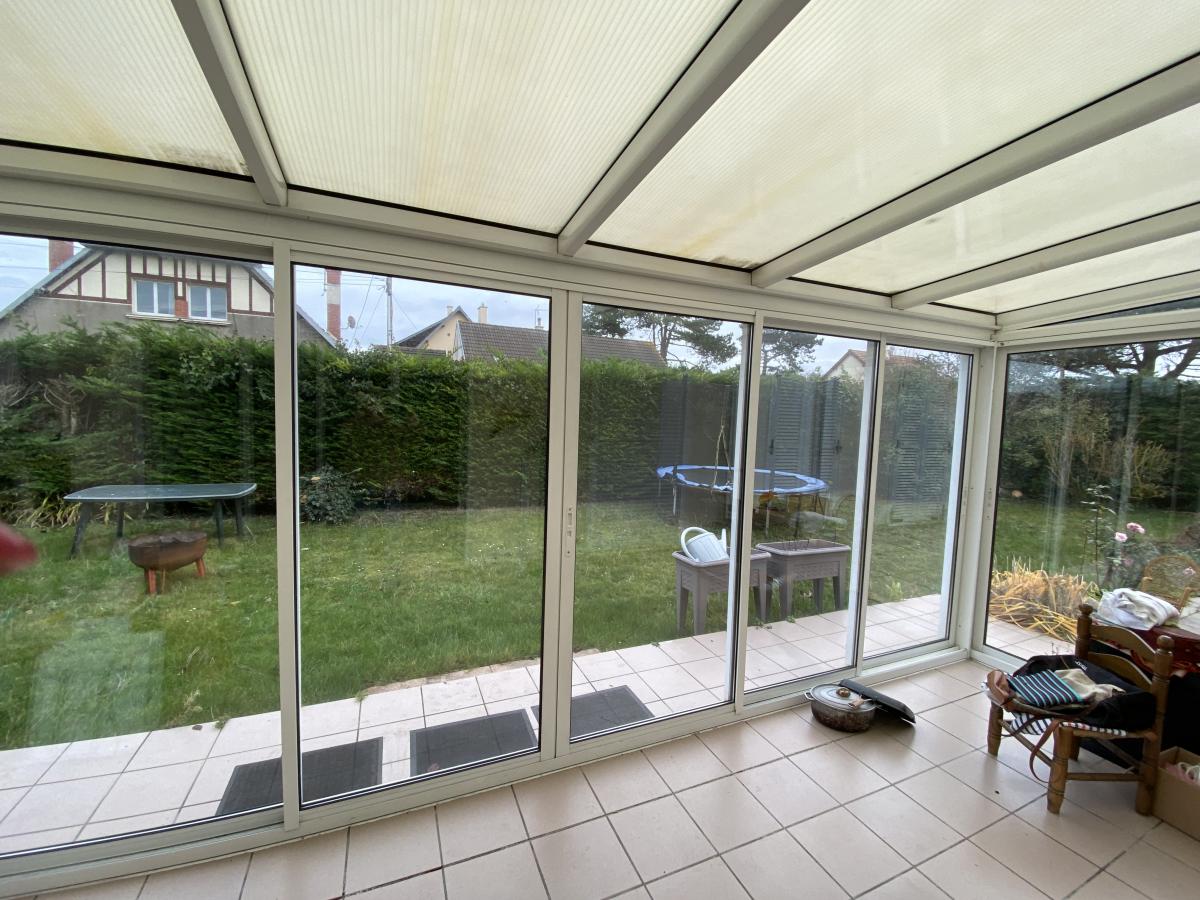 d'une vaste entrée avec placards, séjour salon avec cheminée, véranda, cuisine aménagée, trois chambres, une chambre avec salle de bains, et une salle d'eau.