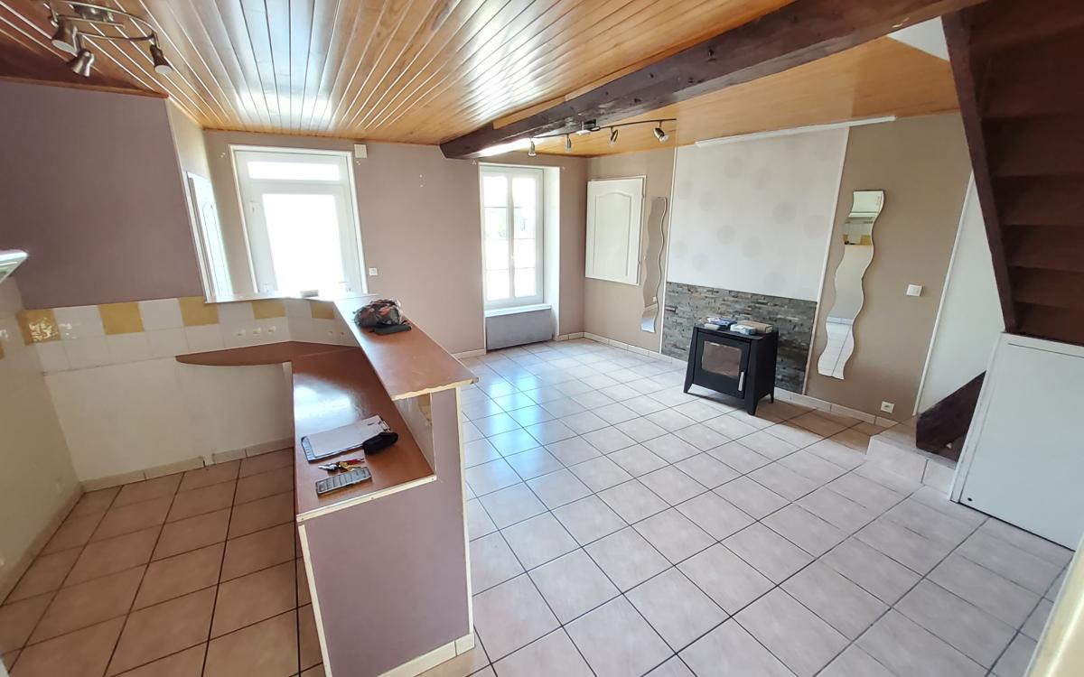 - au rez-de-chaussée : cuisine ouverte sur séjour avec poêle à bois, salon, WC.