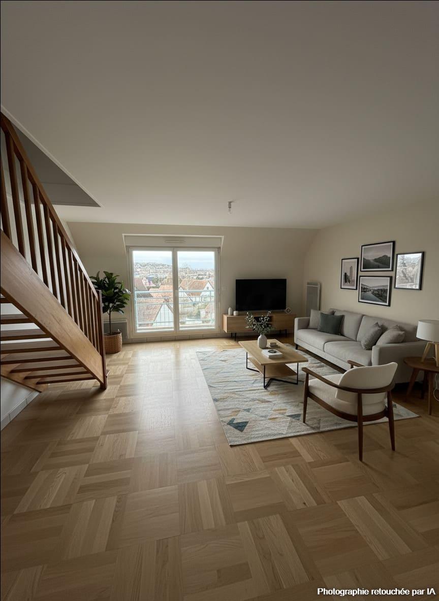 Situé au sein de la résidence sécurisée le Domaine du Royal Panoramique, avenue Charles de Gaulle, au dernier étage avec ascenseur, ce duplex de 75 m² loi Carrez (90 m² au sol) offre une organisation idéale et une belle luminosité.