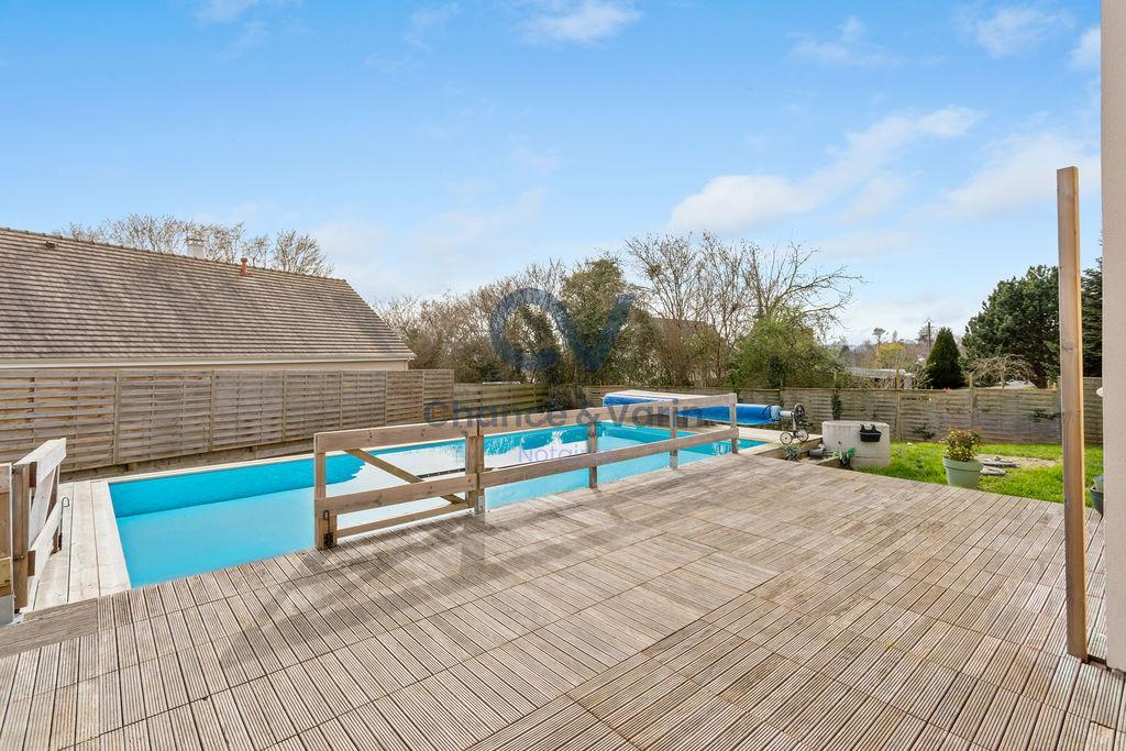 À l’extérieur, le jardin sans vis à vis accueille une agréable terrasse et une piscine, permettant de profiter pleinement des beaux jours dans un environnement calme. Des garages extérieurs complètent l’ensemble, offrant des solutions pratiques de stationnement et de rangement.