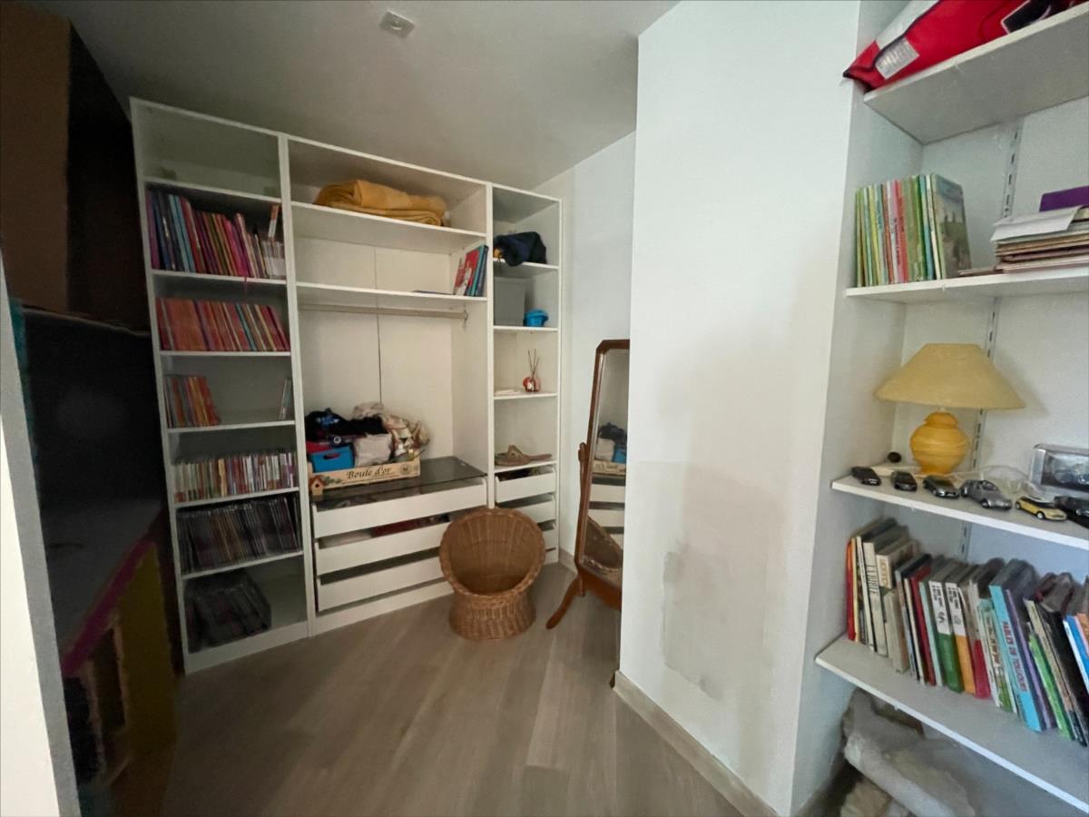 WC, placard, vaste séjour- salon 100m² avec cheminée et terrasse avec partie abritée,