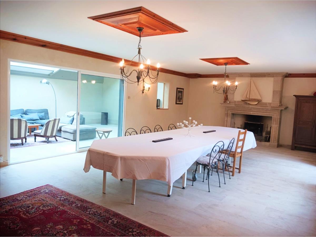 Au rez-de-chaussée : entrée, deux salons, salle à manger avec cheminée, cuisine entièrement aménagée et équipée, belle salle de réception (58 m²) avec cheminée ouverte et un agréable espace bar-salon sous verrière (42 m²). Il y a également des WC et une chaufferie-buanderie.