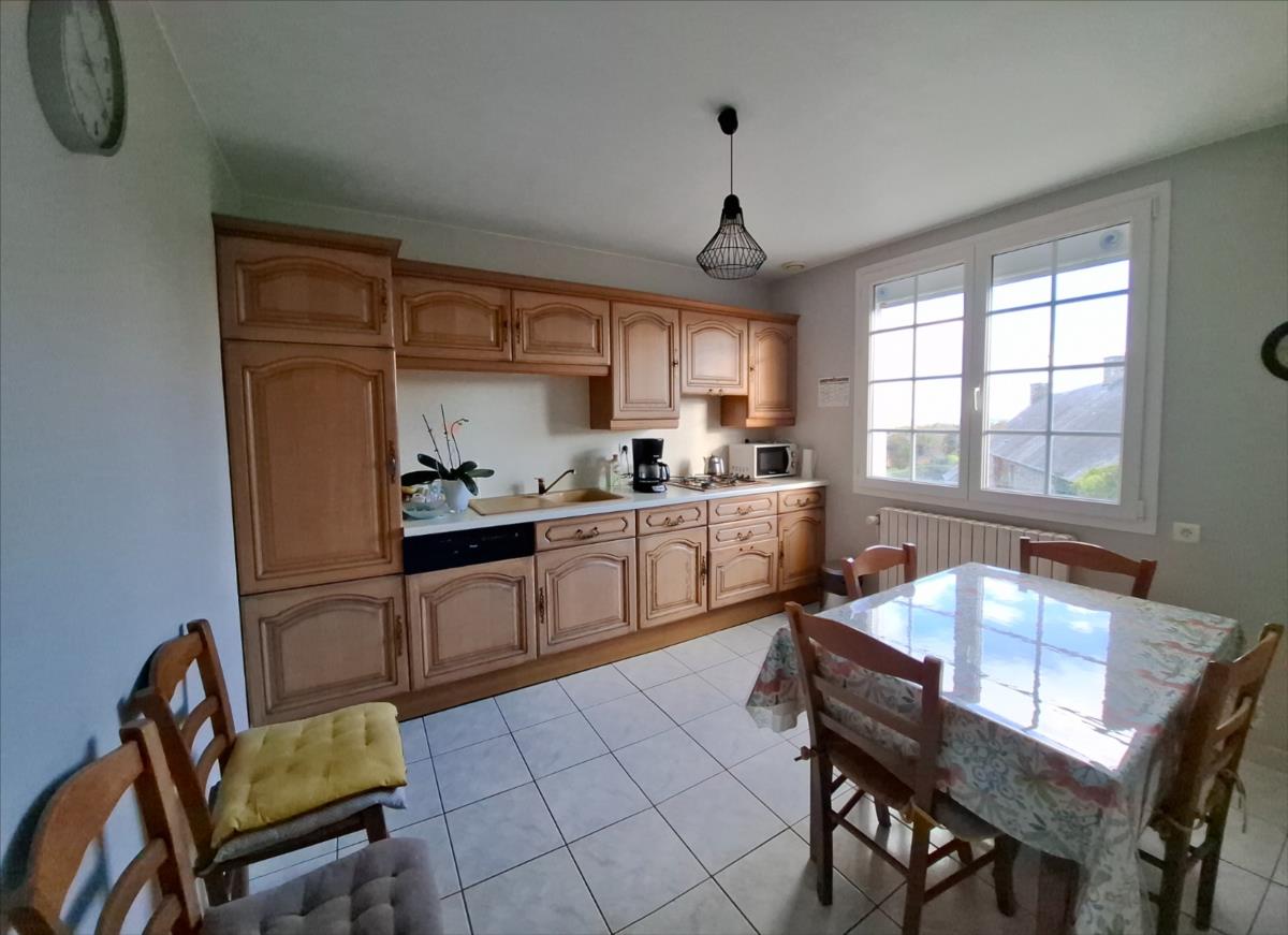- au rez-de-chaussée : couloir, cuisine aménagée avec jolie vue dégagée, salon-séjour, trois chambres, salle de bains, WC.