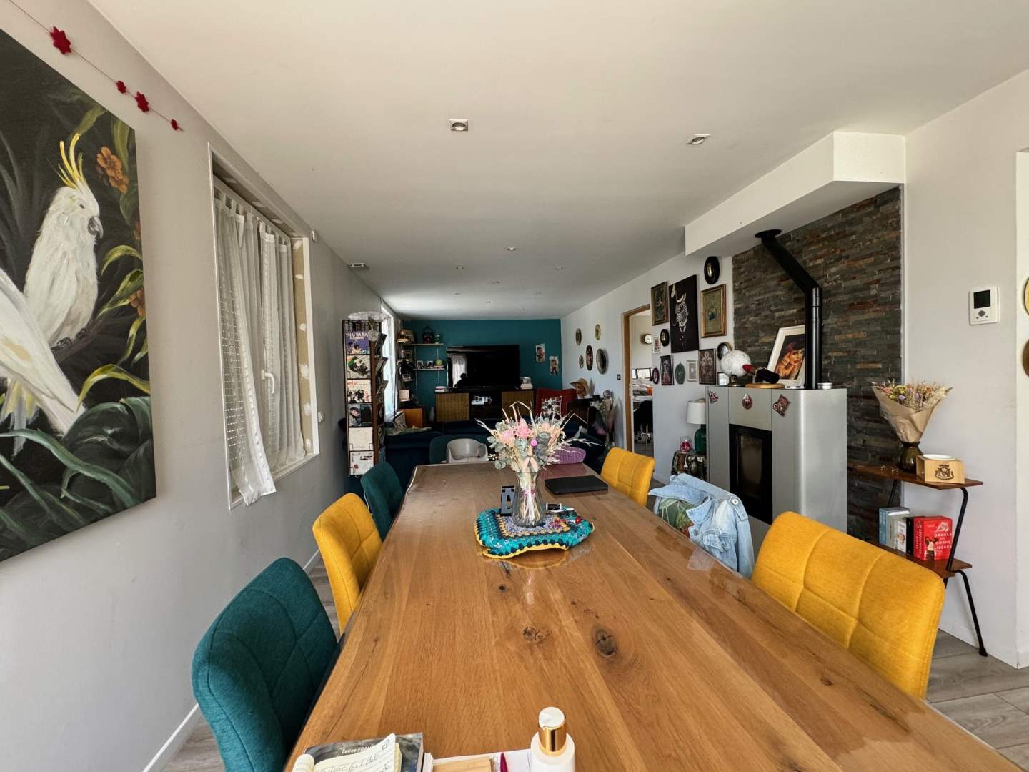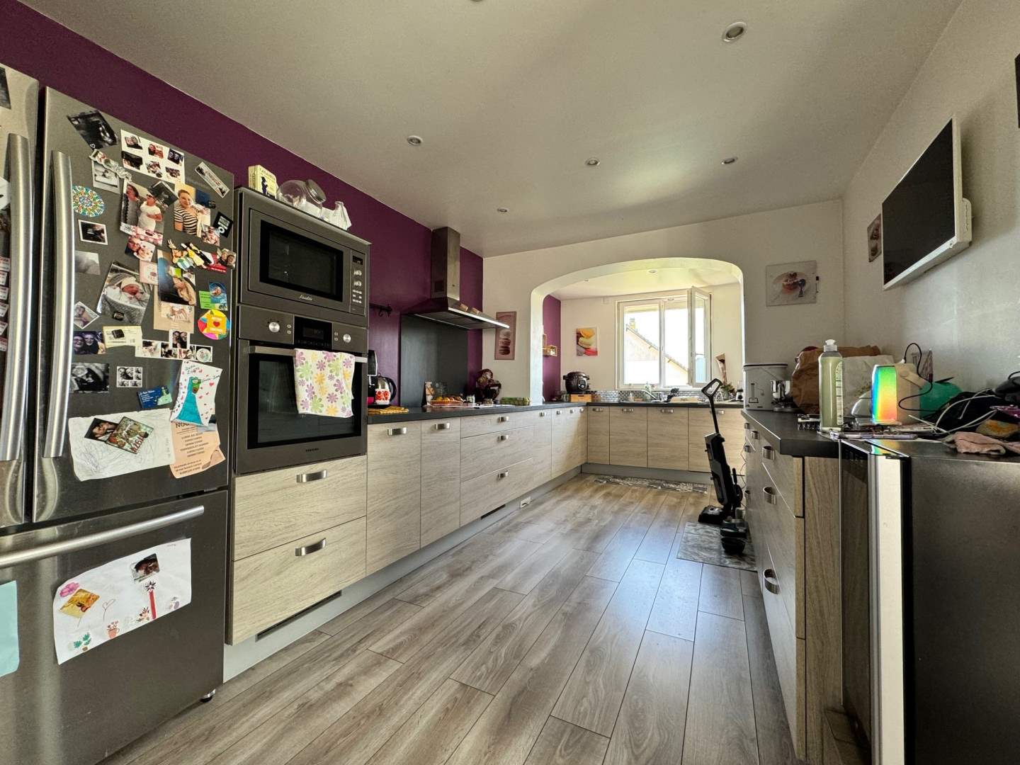 Au rez de chaussée : un vaste salon-salle à manger équipé d'un poêle à granulés, une grande cuisine aménagée et équipée, une suite parentale avec sa salle d'eau et wc, wc.