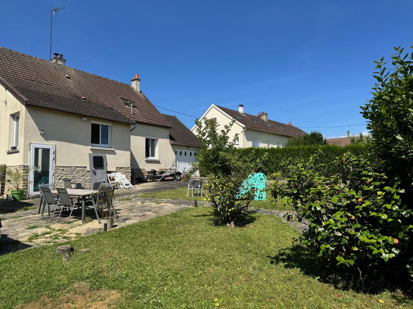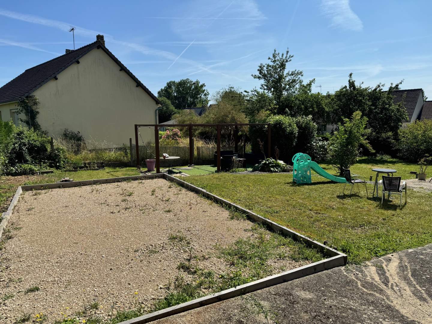 Terrain clos avec un espace gravilloné pouvant accueillir pulsieurs véhicule, jardin.