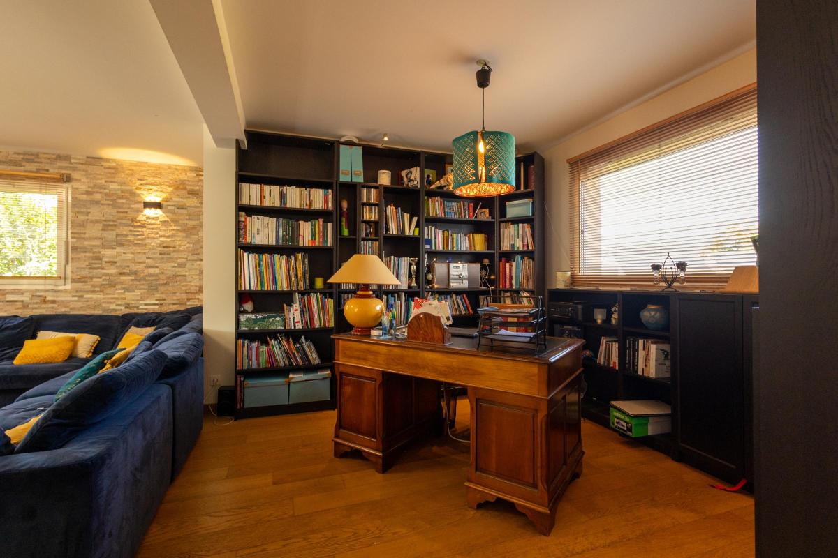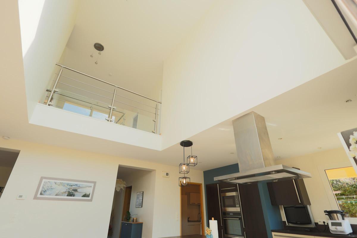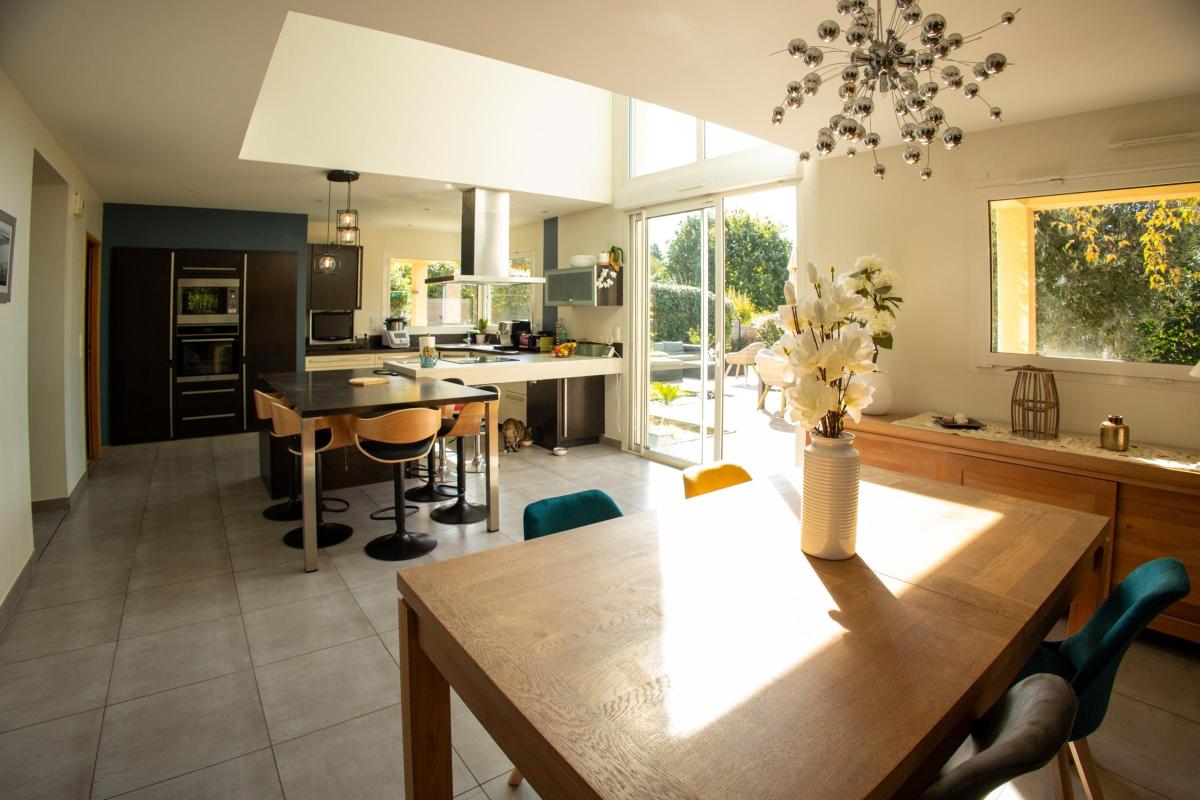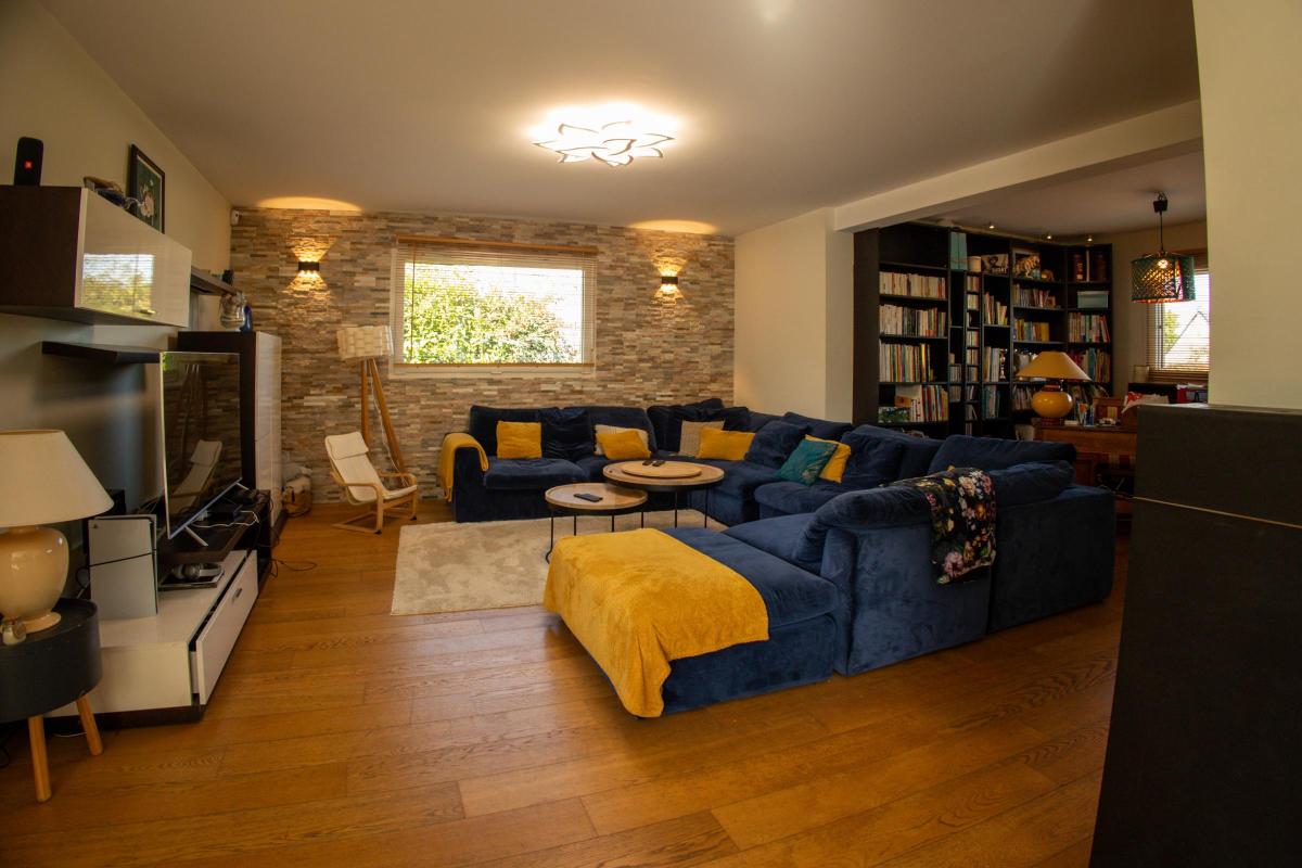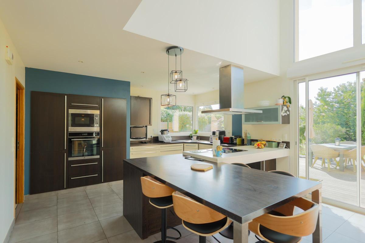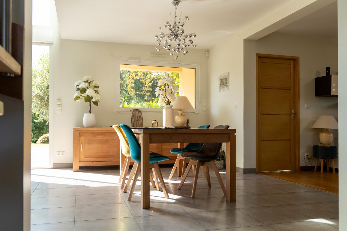 Rez-de-chaussée : une entrée, une grande pièce de vie traversante comprenant une cuisine ouverte, une salle à manger, un salon, un bureau ; une chambre avec salle d'eau privative, WC, une arrière cuisine - buanderie,