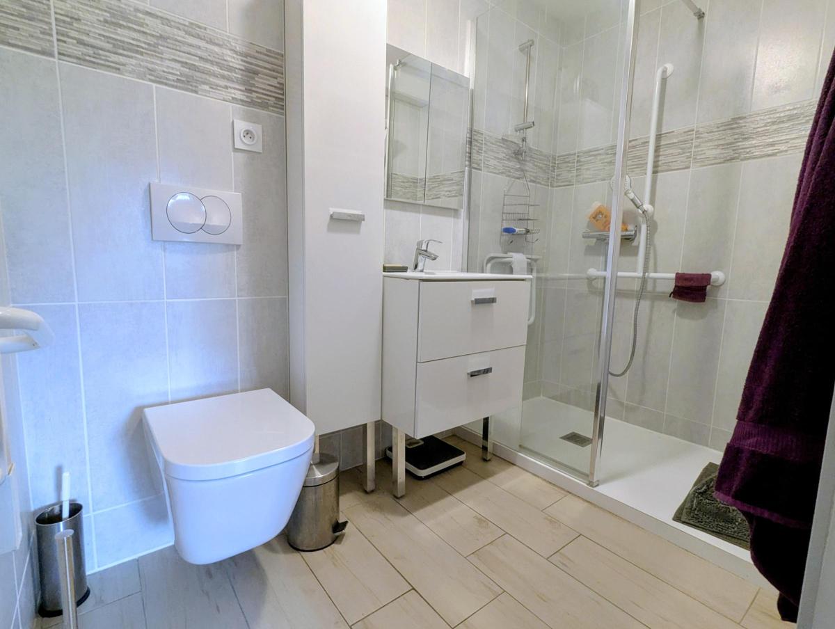 -Rez-de-chaussée : Une entrée desservant une première pièce, Une salle d’eau équipée d’un meuble vasque, d’une douche et de WC, Une cuisine aménagée et équipée (four, lave-vaisselle).