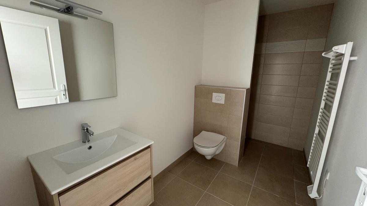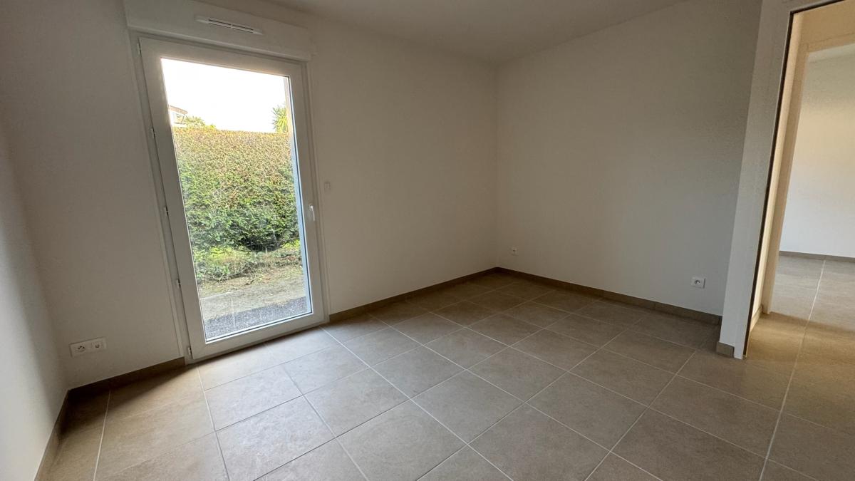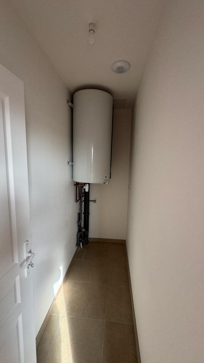 Entrée dans pièce à vivre avec cuisine aménagée et équipée (plaque induction, four, hotte) ouverte sur séjour/salon de 30.7m², cellier, dégagement, deux chambres (12.61m² et 12.14m²), salle de douche et WC.