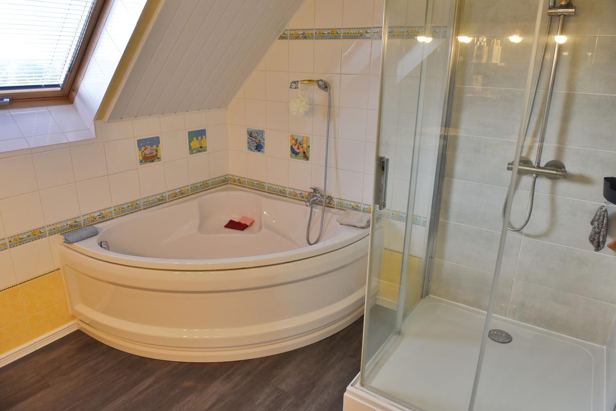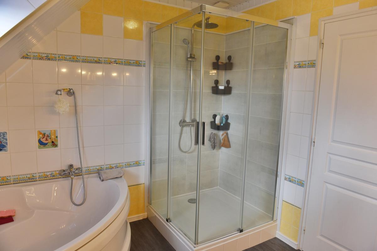 - Grande salle de bains avec baignoire, douche et meuble double vasque, WC.