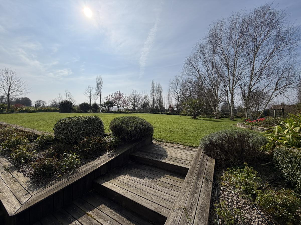 Jardin planté sur l’arrière du bâtiment principal avec grande terrasse en bois et stores. Présence d’un robot tondeuse, d’un système d’arrosage, de panneaux solaires et de deux bornes de recharge pour véhicules électriques.