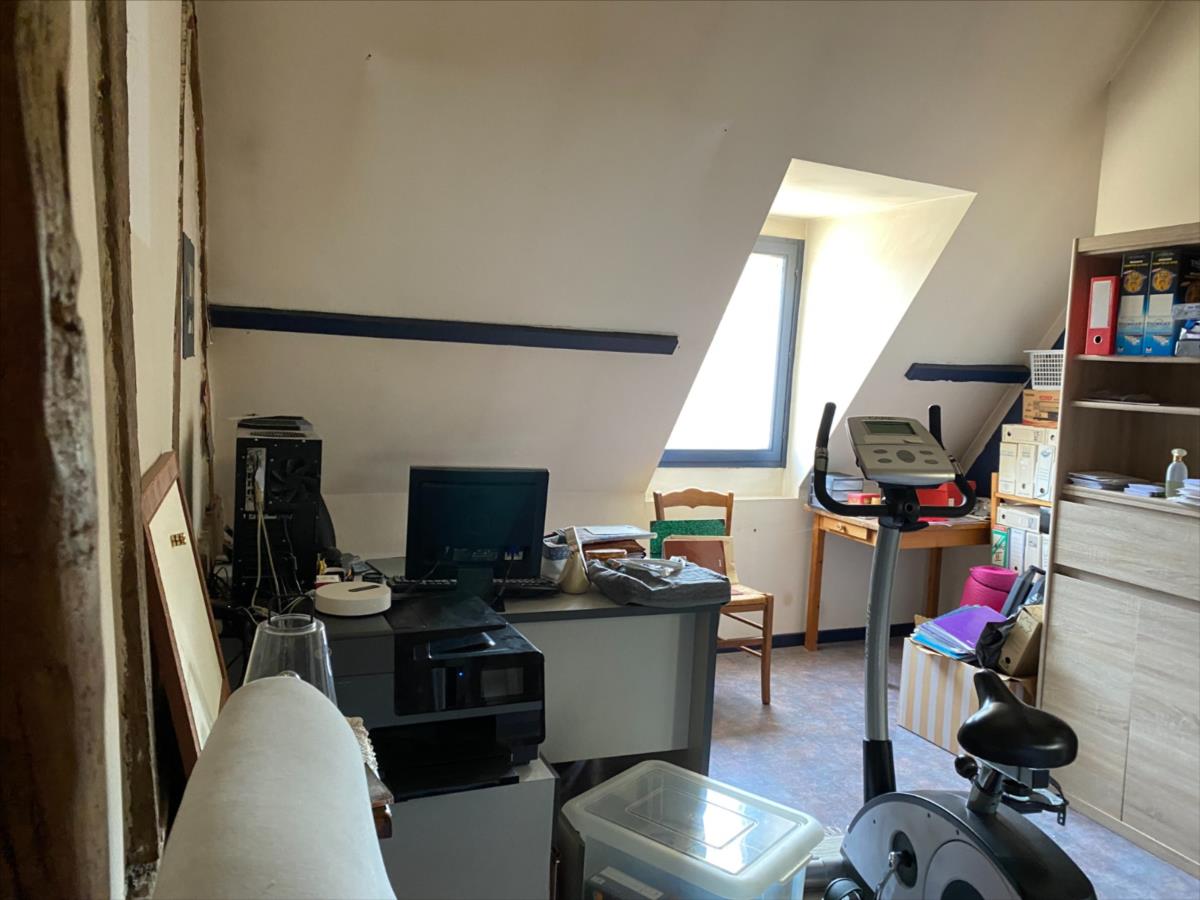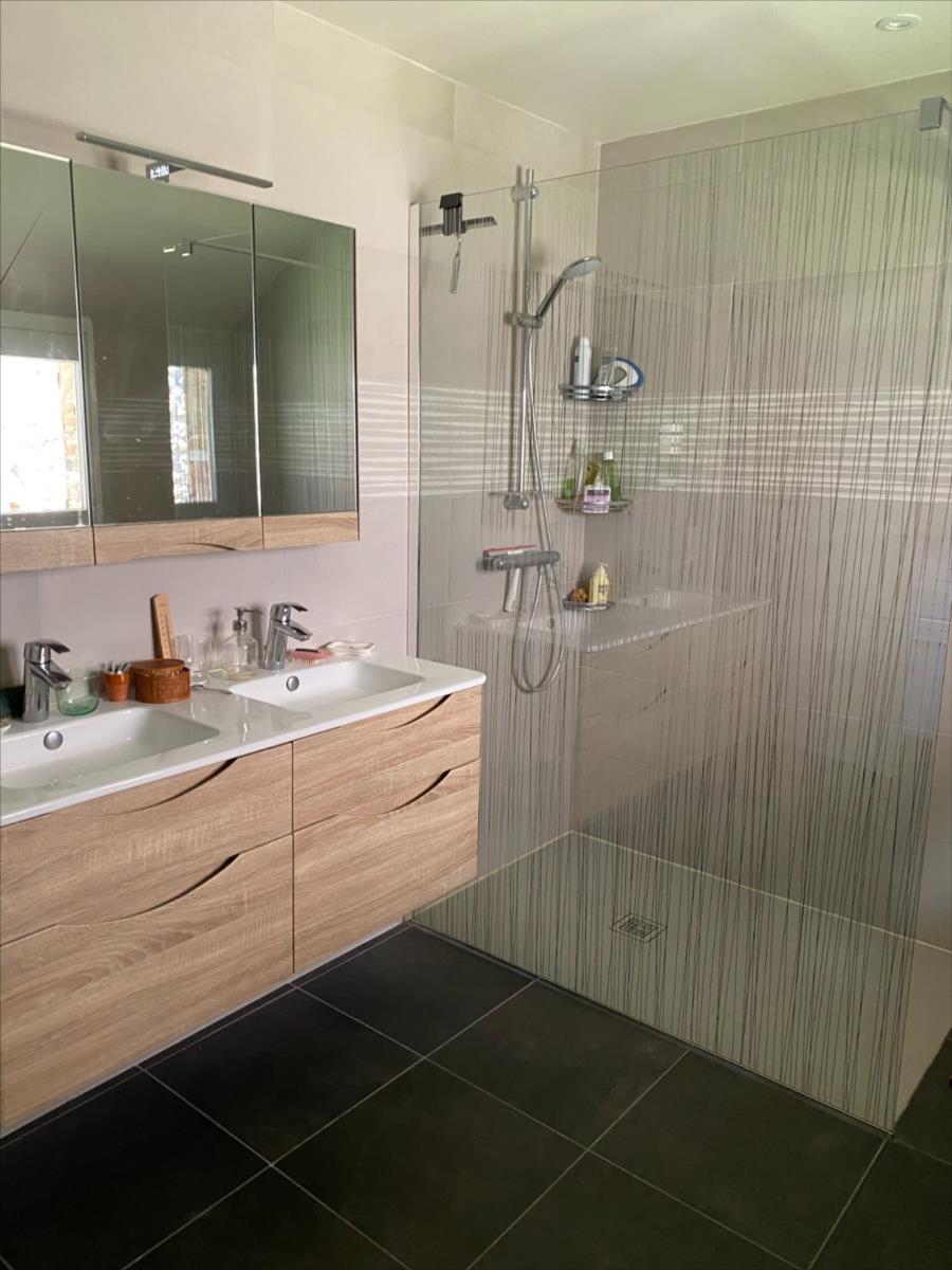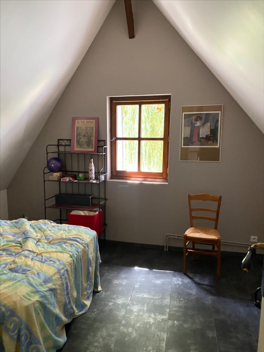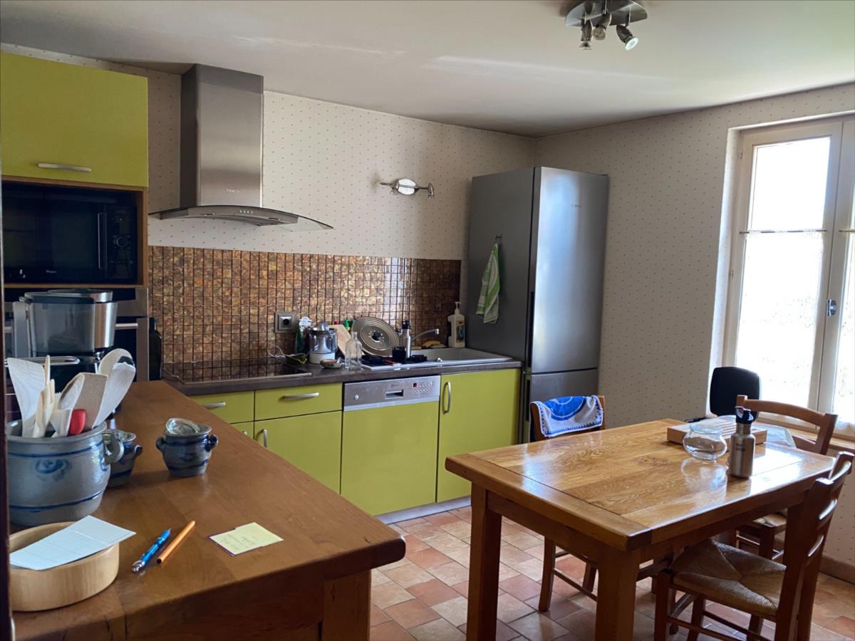 - au RDC: entrée, cuisine aménagée et équipée, salle à manger semi ouvert sur salon avec poêle à bois, dégagement, chambre, salle d'eau, wc, cellier.