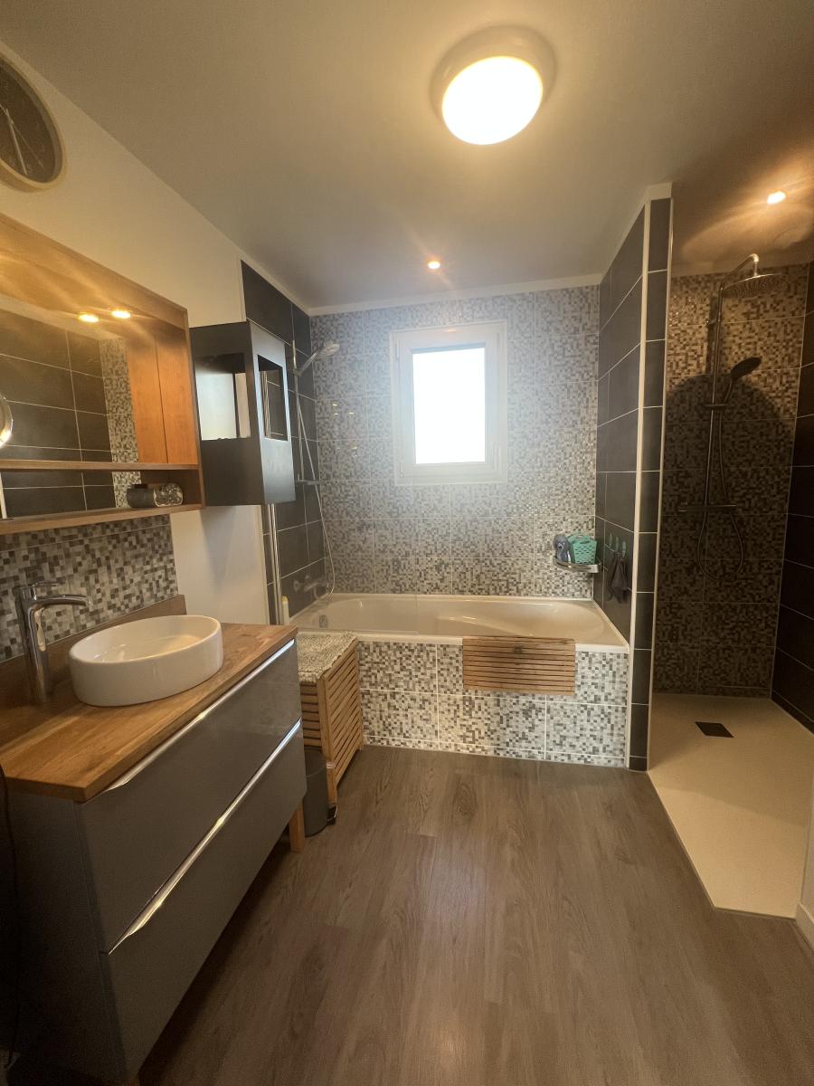 Garage porte motorisée donnant directement dans la maison, carport avec prise pour voiture électrique, portail électrique, fibre. Terrain clos de 930 m2.