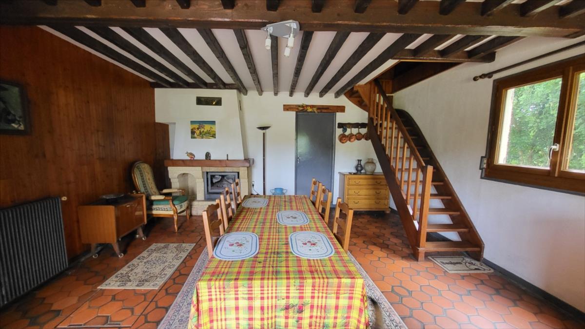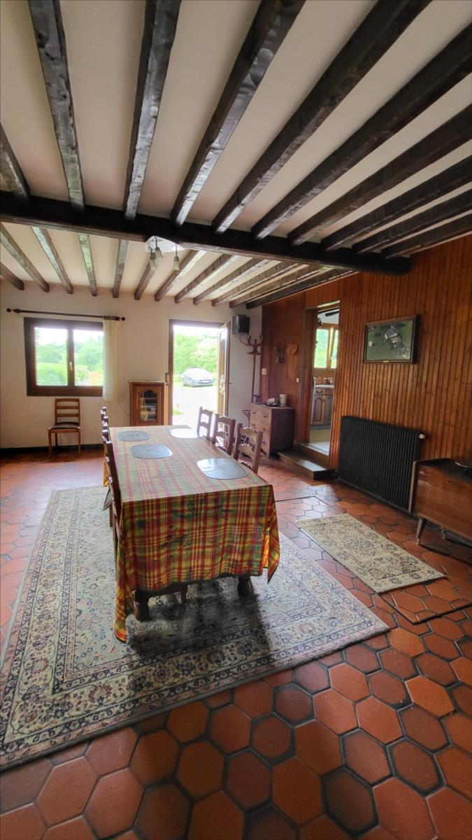 Maison d'environ 170 m² : salle à manger avec escalier, cuisine rustique, salon, couloir, salle de douche, wc séparés, coin buanderie, deux chambres, chaufferie avec chaudière au fioul, cuve et chauffe-eau. à l'étage : palier, pièce-dégagement, deux chambres, salle de douche avec wc, bureau.Petit bâtiment en colombage. Garage. Beau terrain avec verger. Les informations sur les risques auxquels ce bien est exposé sont disponibles sur le site Géorisques : www. georisques. gouv. fr