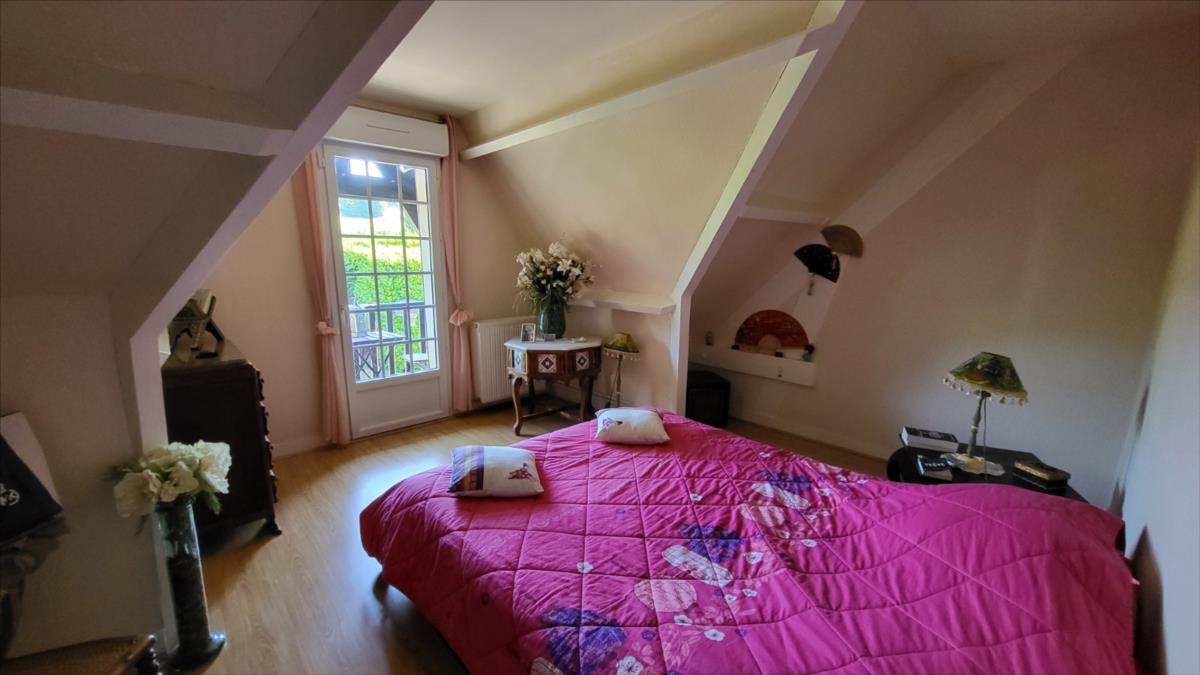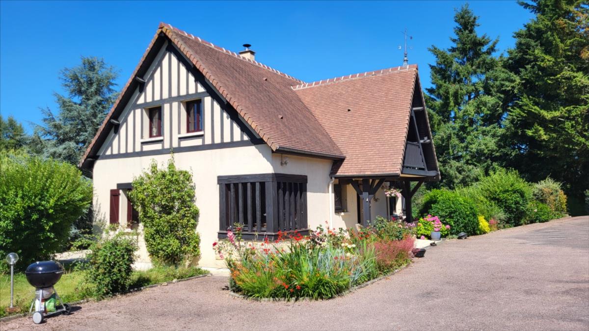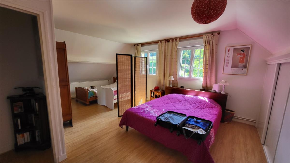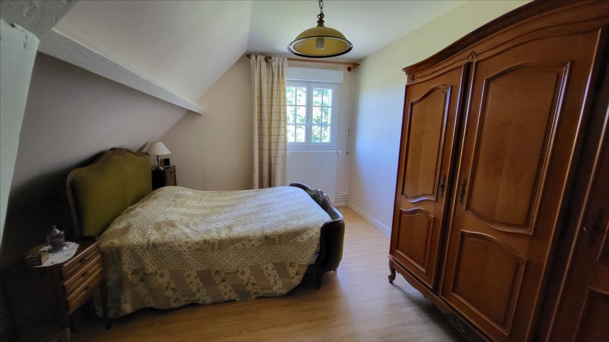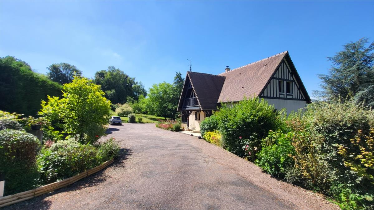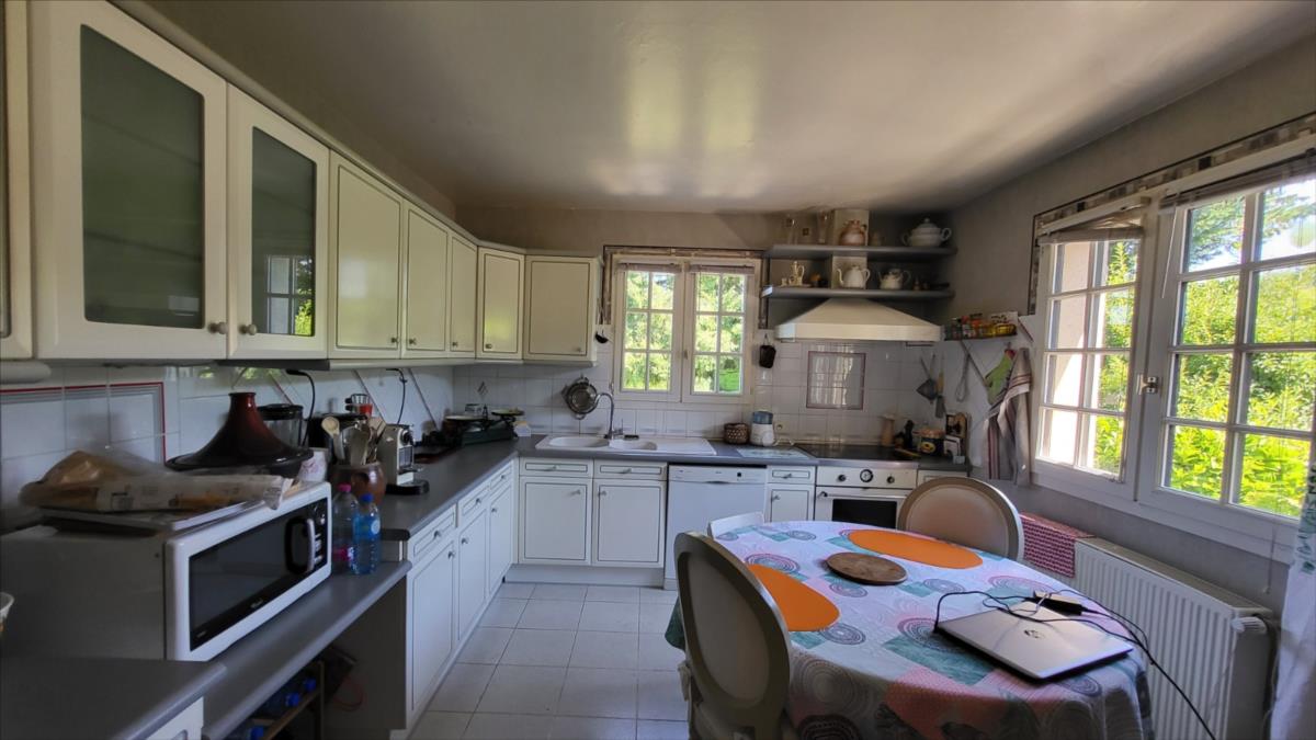 Dans un quartier au calme, à  1,5 km du centre ville de Vimoutiers, maison d'environ 133 m² bien entretenue comprenant : entrée avec placard-penderie, séjour avec baie vitrée donnant sur terrasse à l'extérieur et avec cheminée équipée d'un insert, cuisine aménagée et équipée (four, plaque de cuisson, hotte, lave-vaisselles), dégagement avec escalier desservant une salle de douche avec wc, une chambre ; à l'étage : couloir desservant trois chambres avec placard dont une avec balcon, salle de bains , wc séparés; sous-sol complet comprend partie garage, atelier, chaufferie et buanderie, avec adoucisseur d'eau, l'ensemble sur terrain arboré, avec source, allée goudronnée pour accès garage. Portail d'entrée électrique.