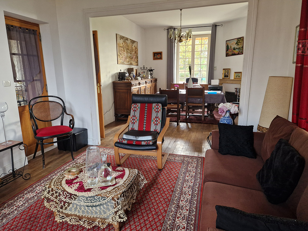 Le séjour-salon, d’une superficie de 30 m², bénéficie d’un parquet et de quatre fenêtres en double vitrage, apportant une belle luminosité.