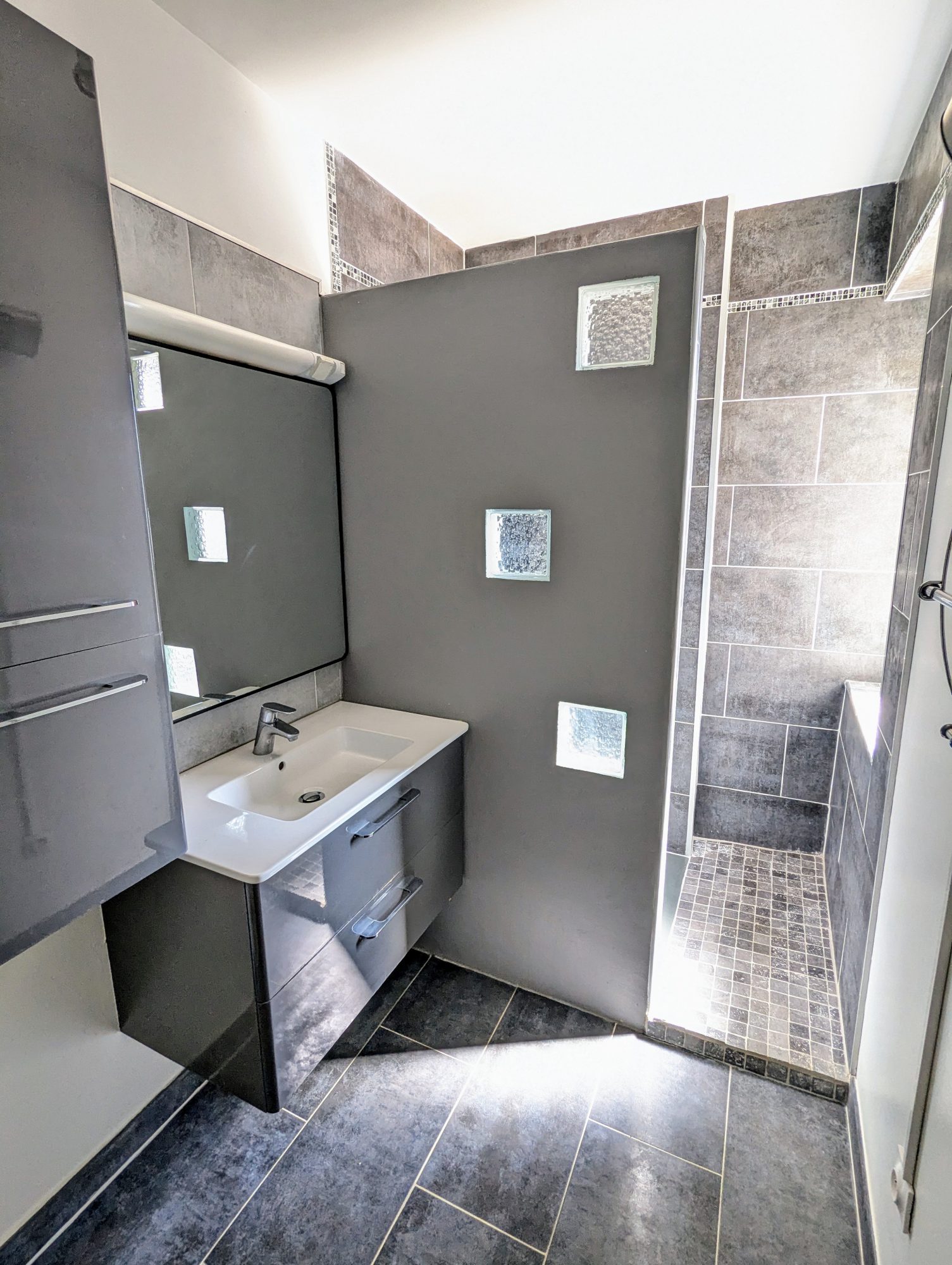 Le premier logement, situé au premier étage, est un appartement d'environ 85m². Il se compose d'un spacieux séjour avec cuisine ouverte, d'une salle d'eau, d'un WC séparé et d'un salon avec accès à un petit balcon. À l'étage supérieur, trois chambres.