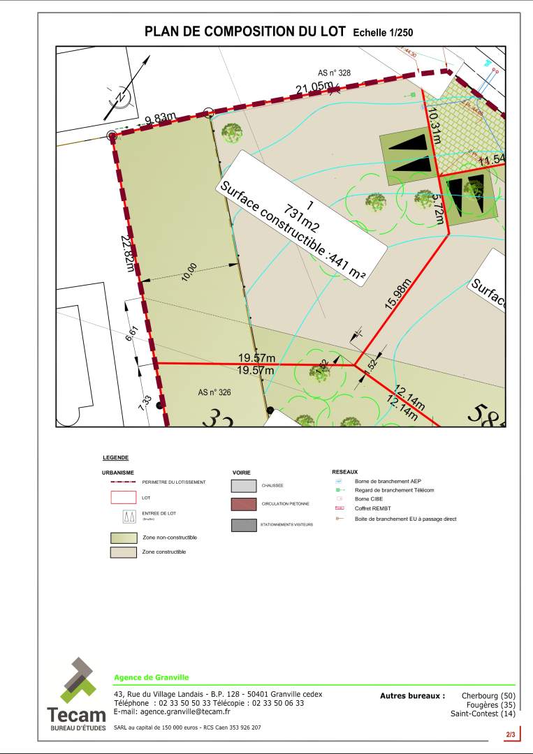 A 500m du coeur de ville, dans un bel environnement, terrain â bâtir (lot n°1) de 731m² dont 441m² de constructible viabilisé (eau, électricité, tout à l'égout, fibre).