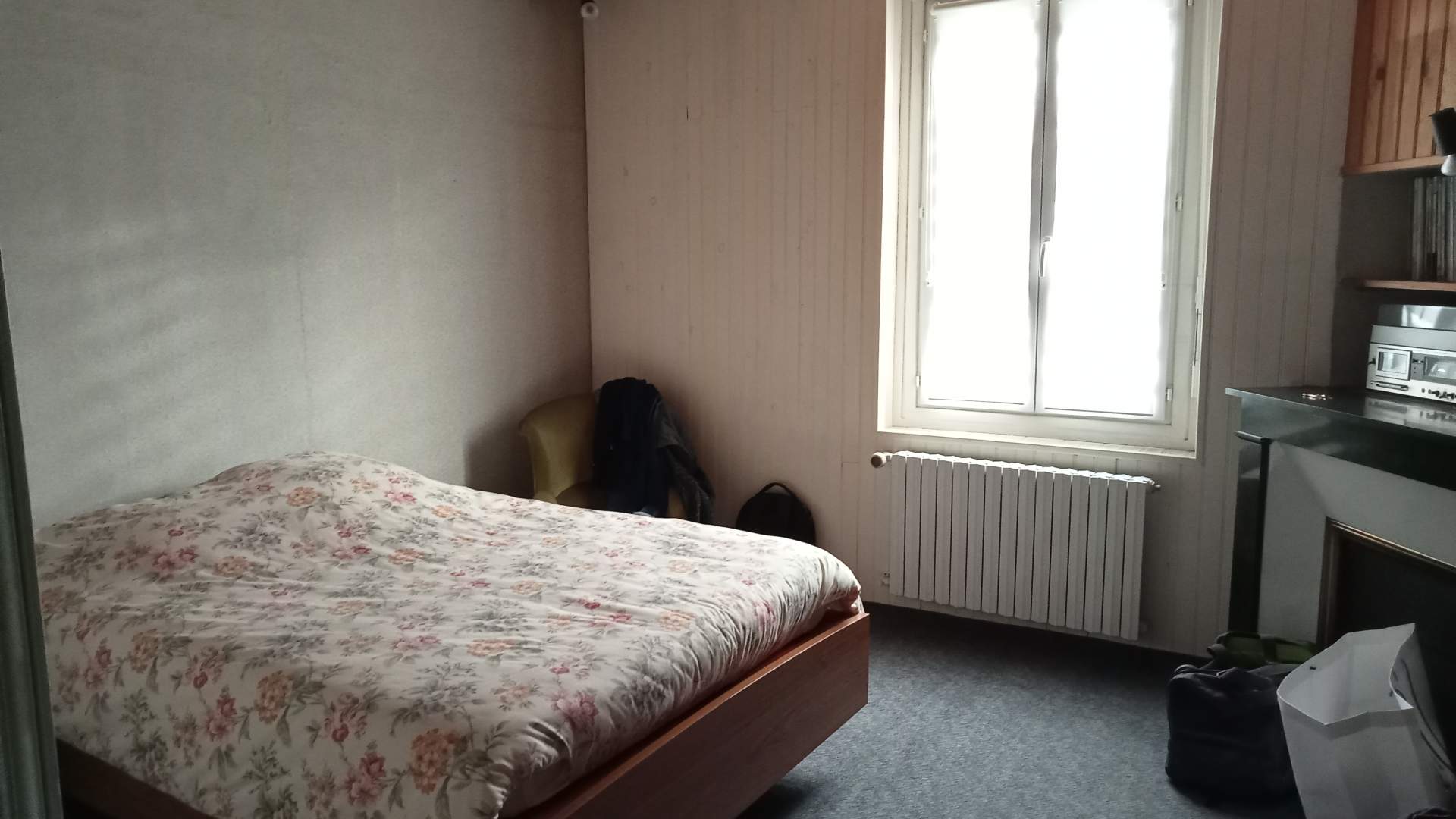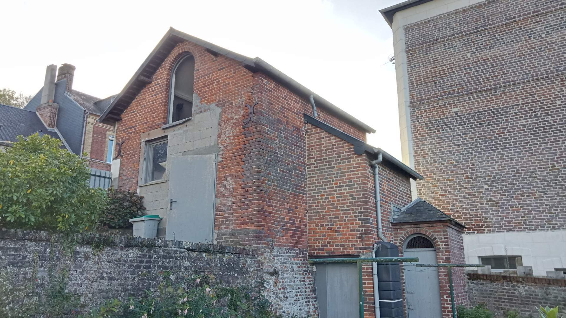 En rez de jardin, une véranda, une cuisine, caves, une chambre, une salle de douche, un wc, pièces à finir.