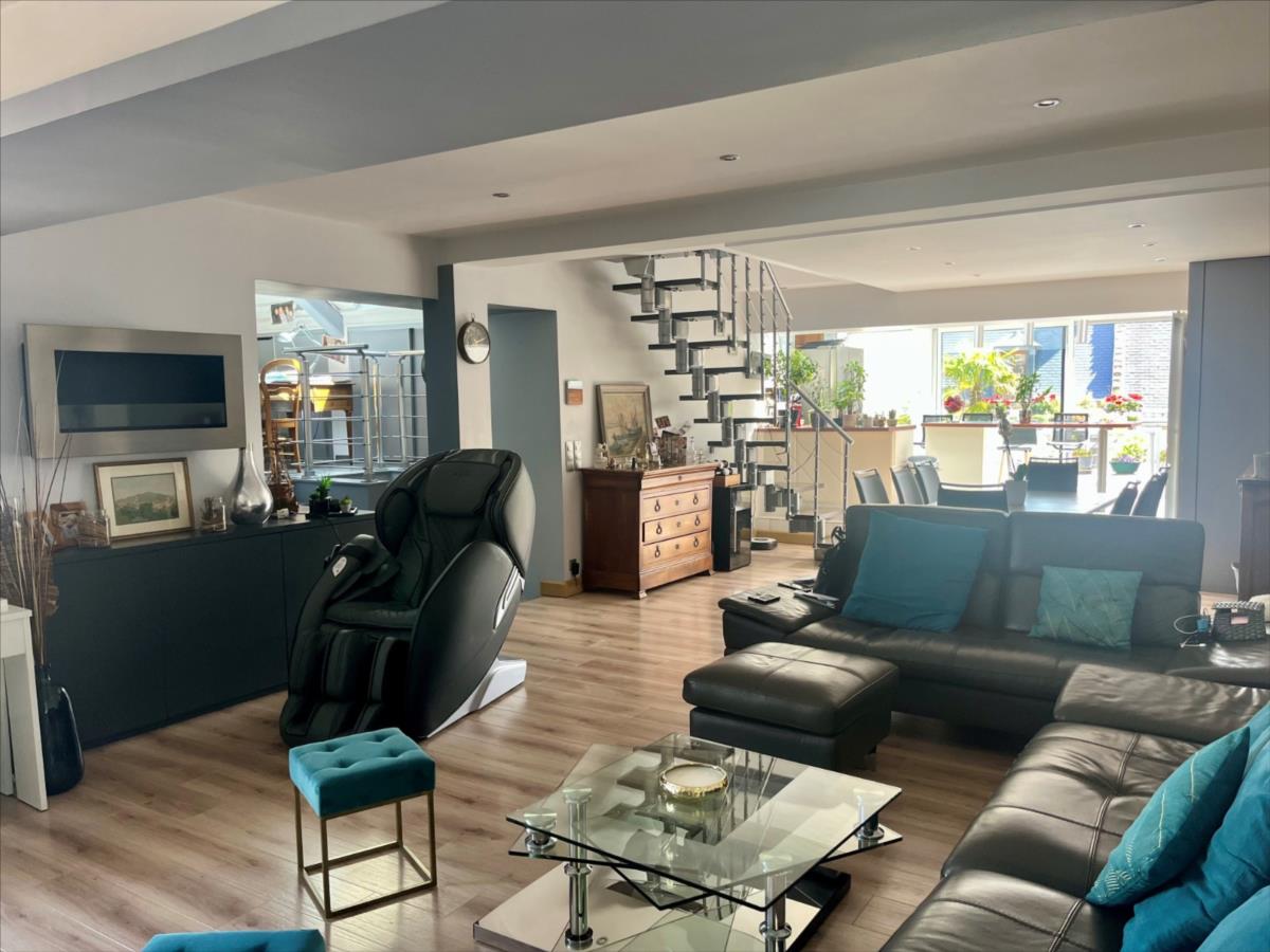 étage : une pièce de vie lumineuse triple exposition de 67m² comprenant une cuisine aménagée avec terrasse, un séjour/salon avec deux terrasses, un bureau, une chambre avec une mezzanine au-dessusUn escalier