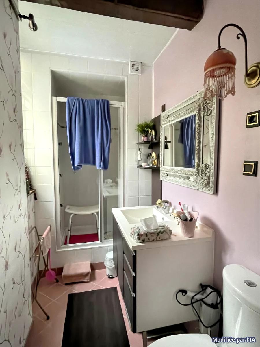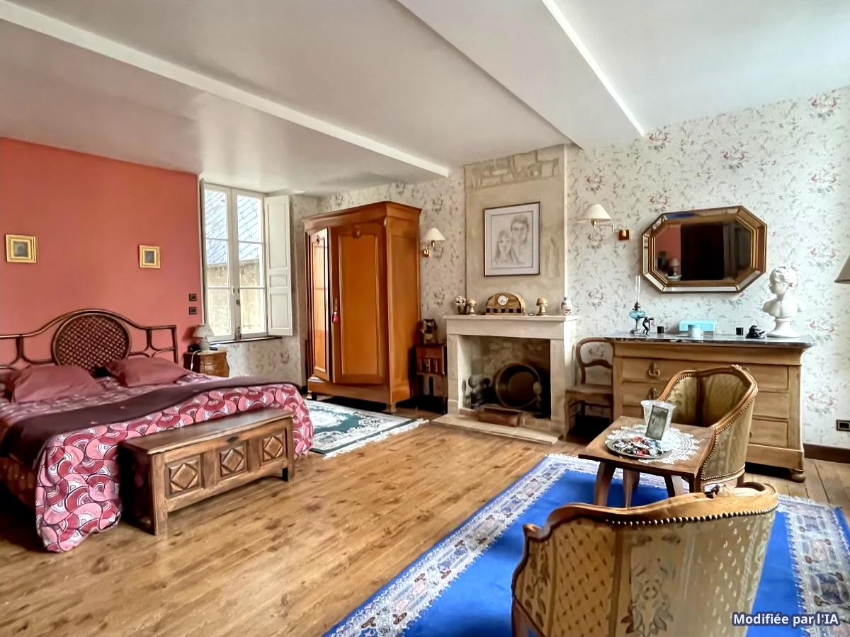 Au 1er étage, l’appartement dispose d’une salle d’eau avec WC, et d’un bel espace chambre/boudoir traversant, plein de charme, avec cheminée décorative.