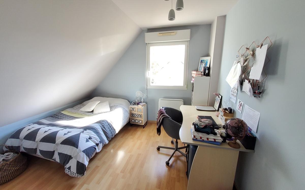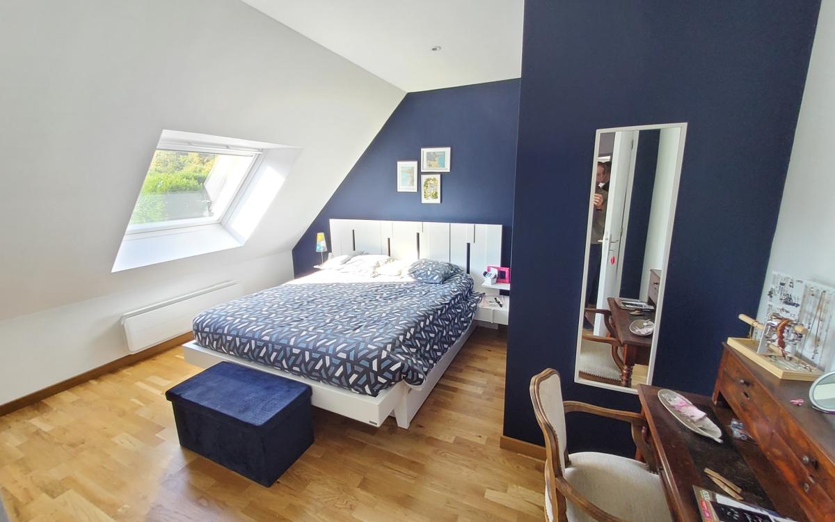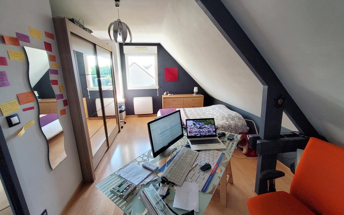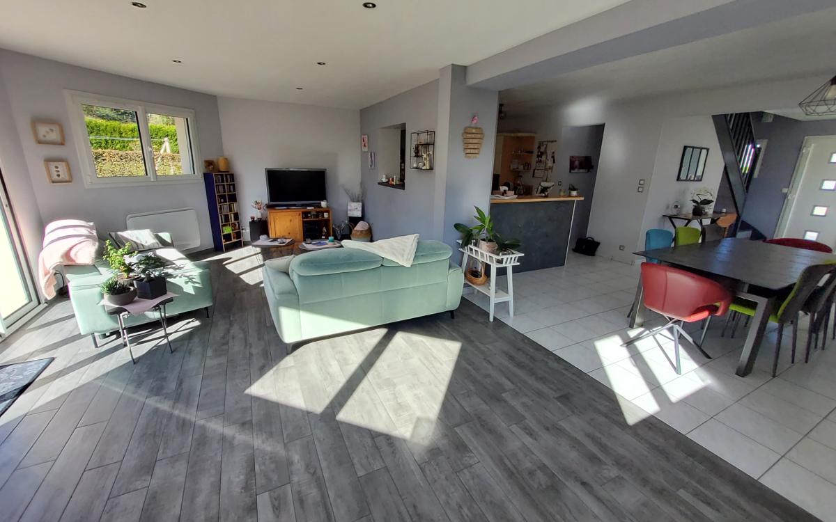 - au rez-de-chaussée : séjour-salon avec poêle à granules, cuisine ouverte aménagée et équipée, salon donnant sur terrasse plein sud, chambre, wc, salle d'eau.