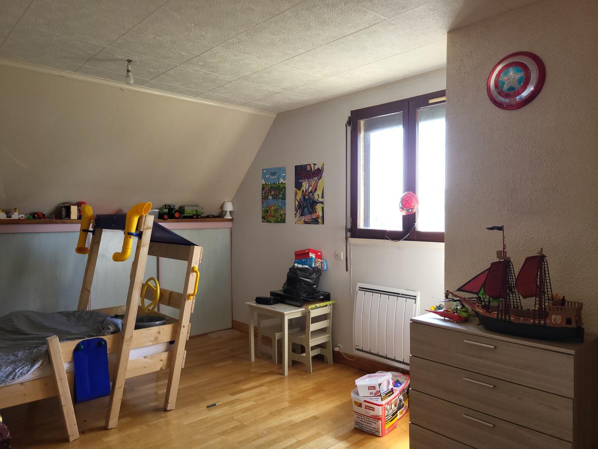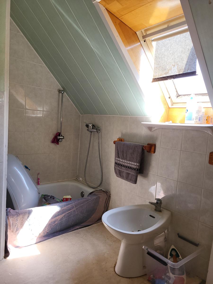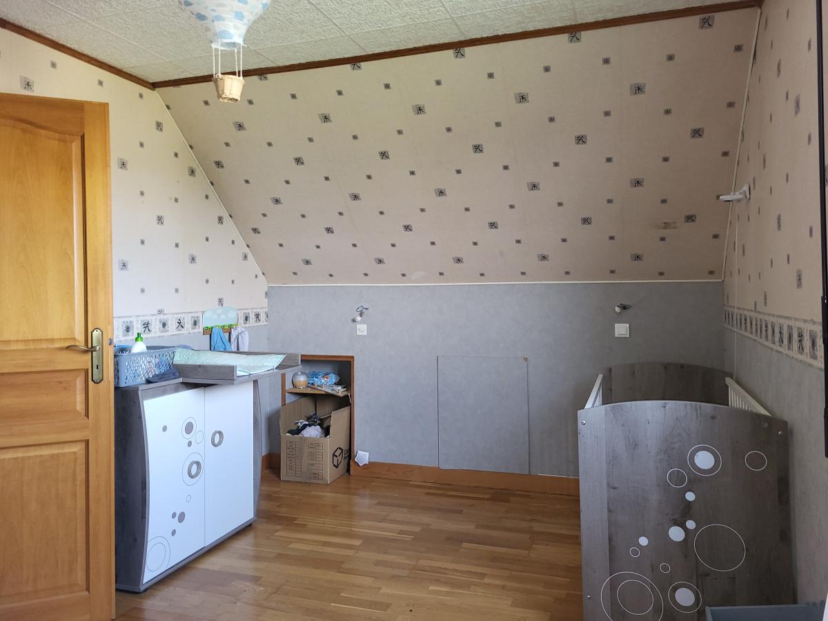 A l'étage : palier à usage de bureau, 2 chambres, salle de bains avec wc