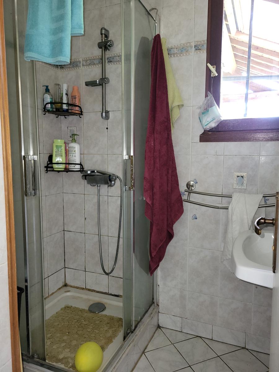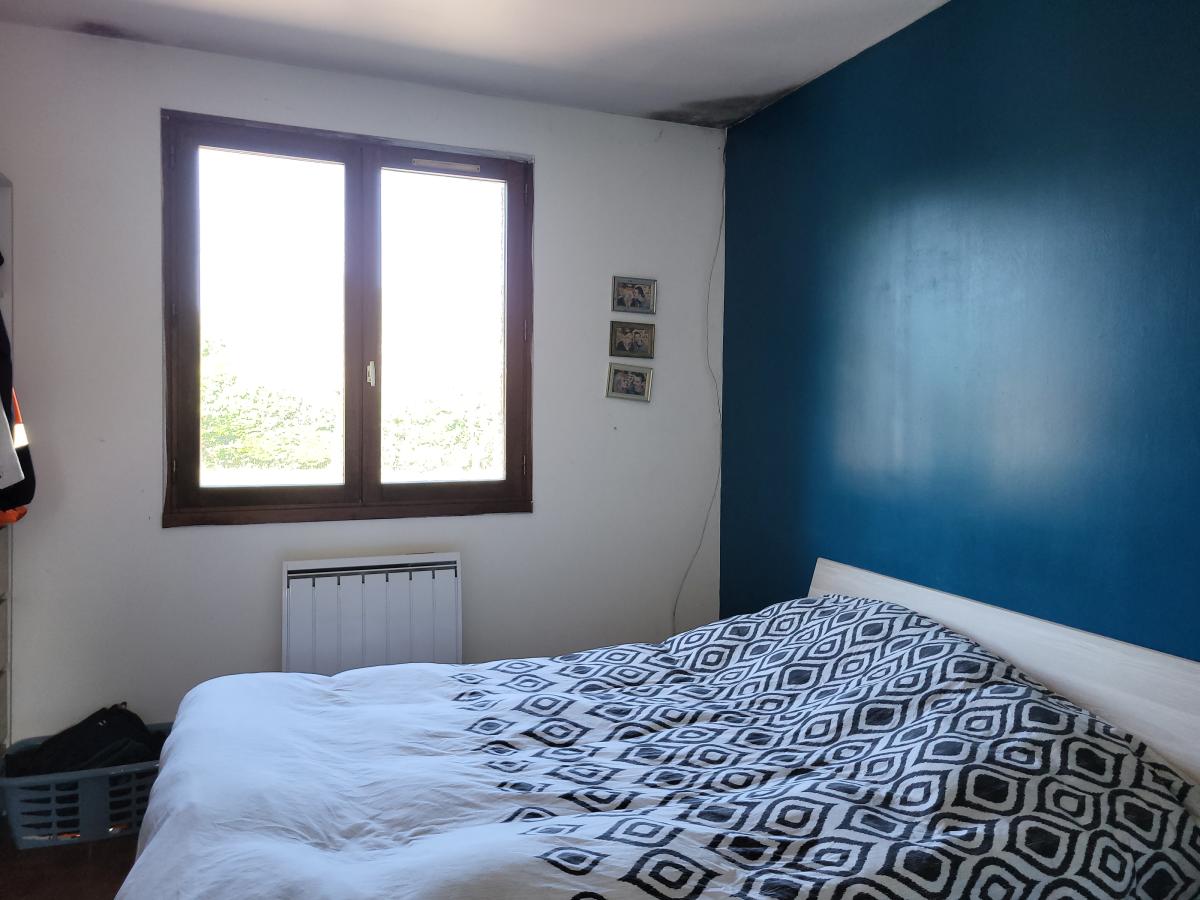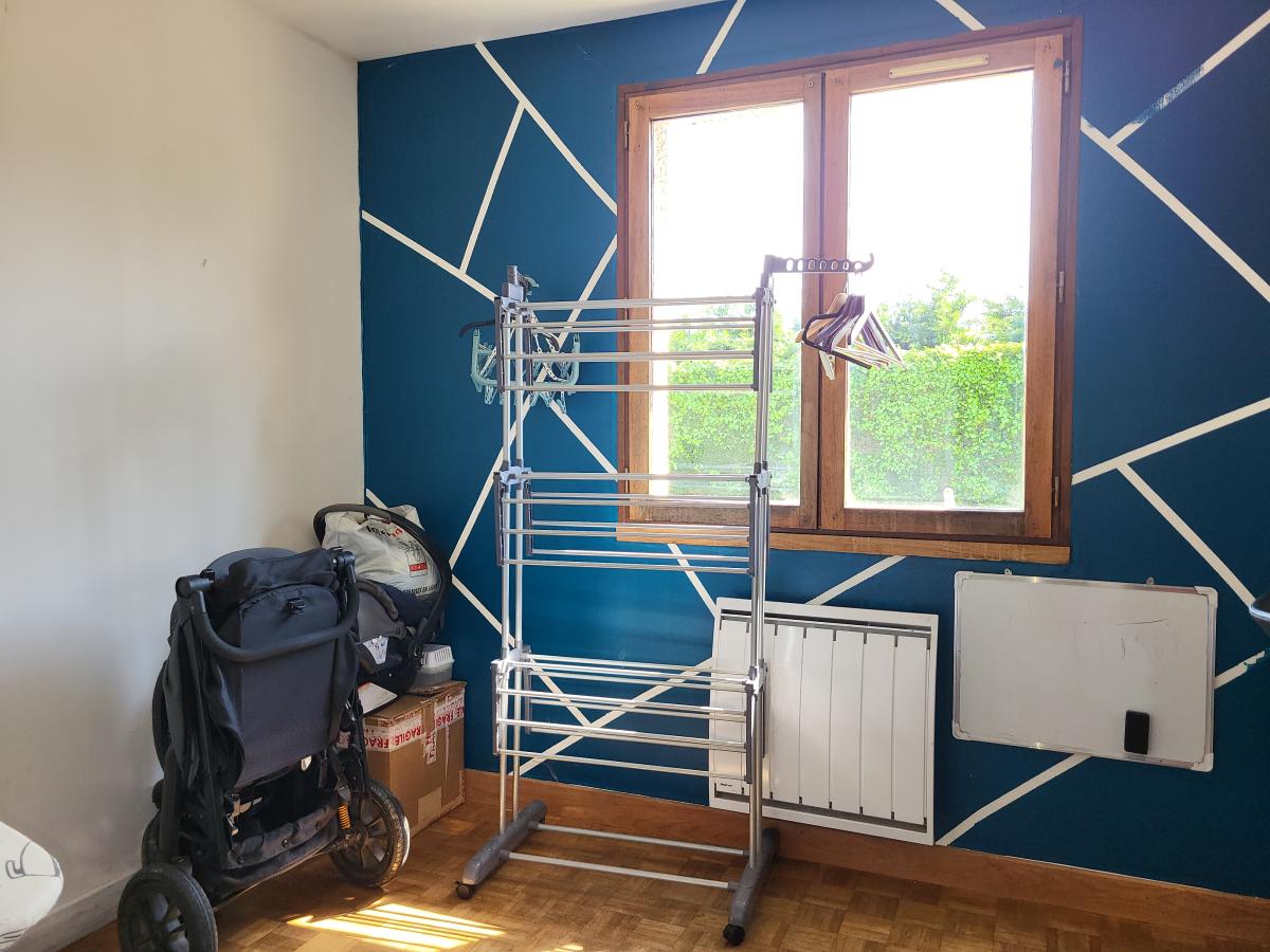 A l'étage : palier à usage de bureau, 2 chambres, salle de bains avec wc