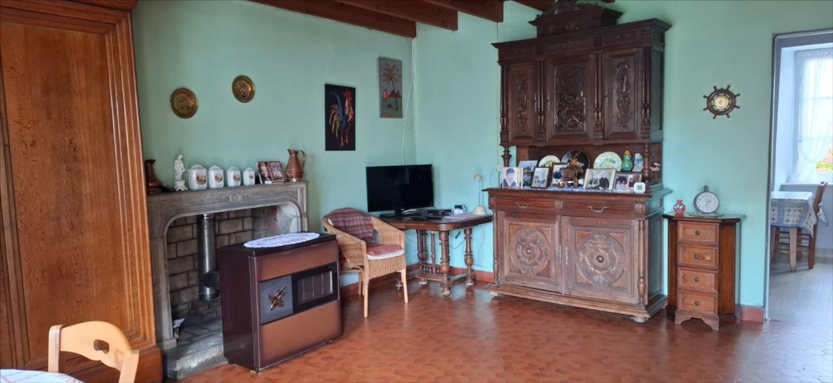 au rez-de-chaussée : séjour avec poêle à fioul, cuisine, dégagement - couloir, WC,