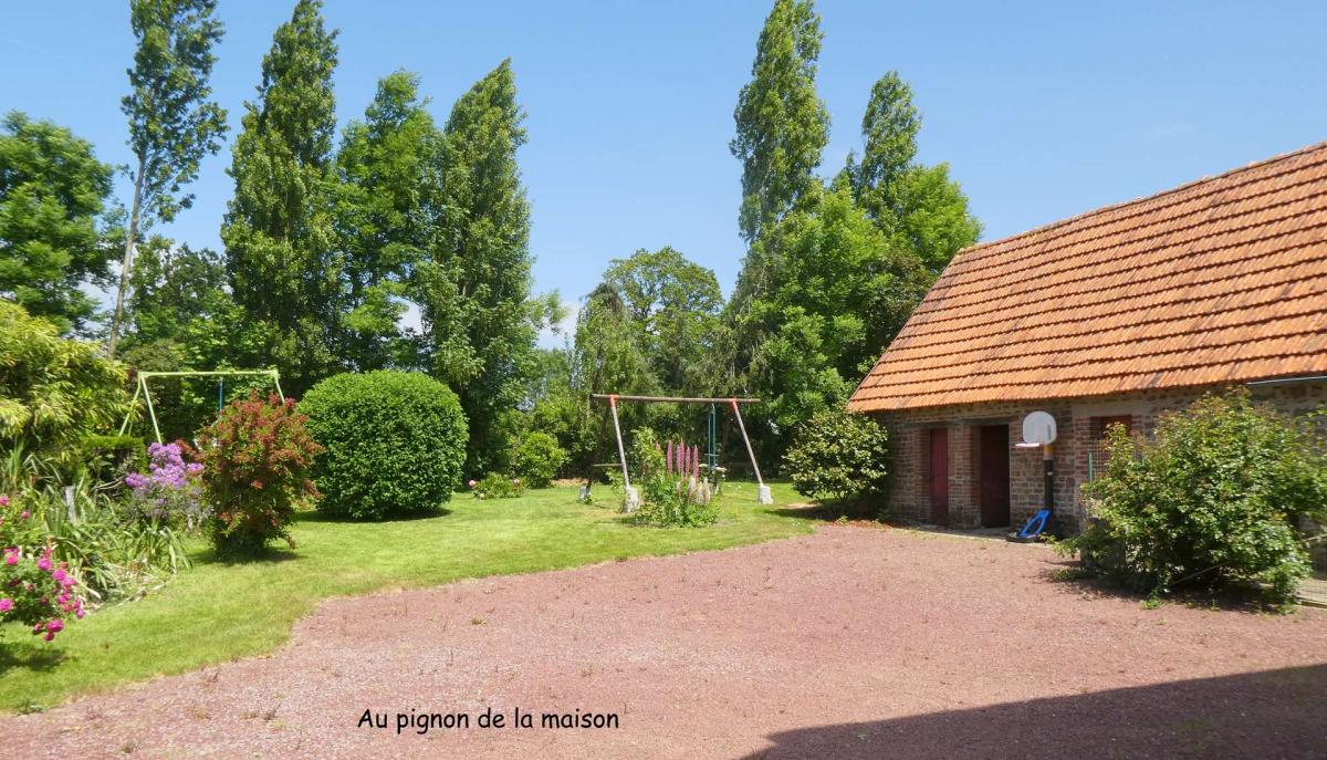Extérieurs : terrain aménagé et arboré avec mare.