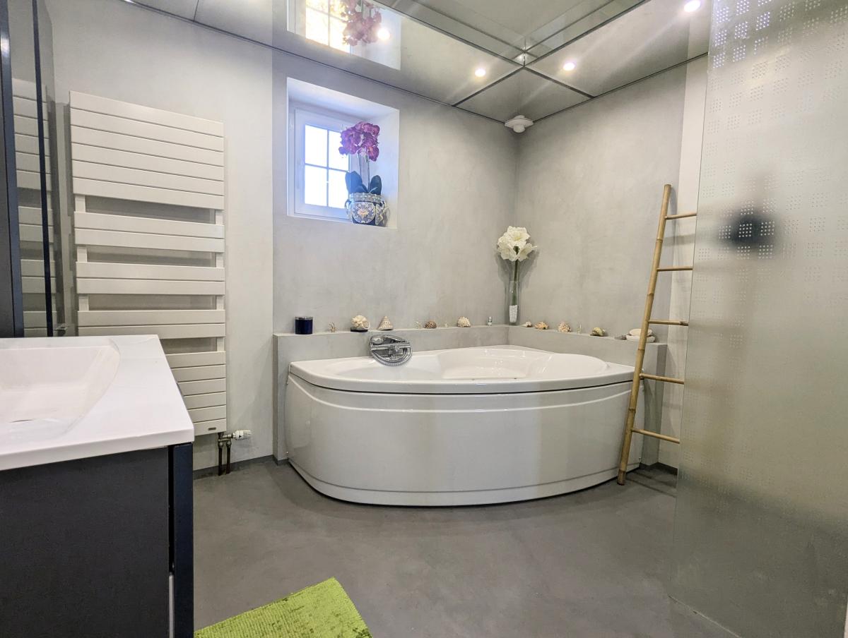 - Au rez-de-chaussée, une entrée s’ouvre sur un séjour salon équipé d’un poêle à bois, une cuisine aménagée et équipée, une chambre , un WC indépendant ainsi qu’une salle d’eau avec baignoire balnéo, douche à l’italienne.