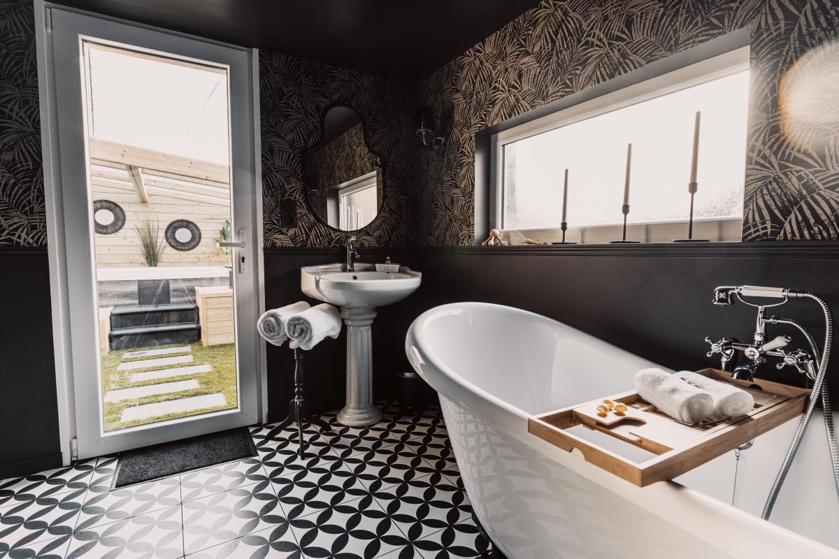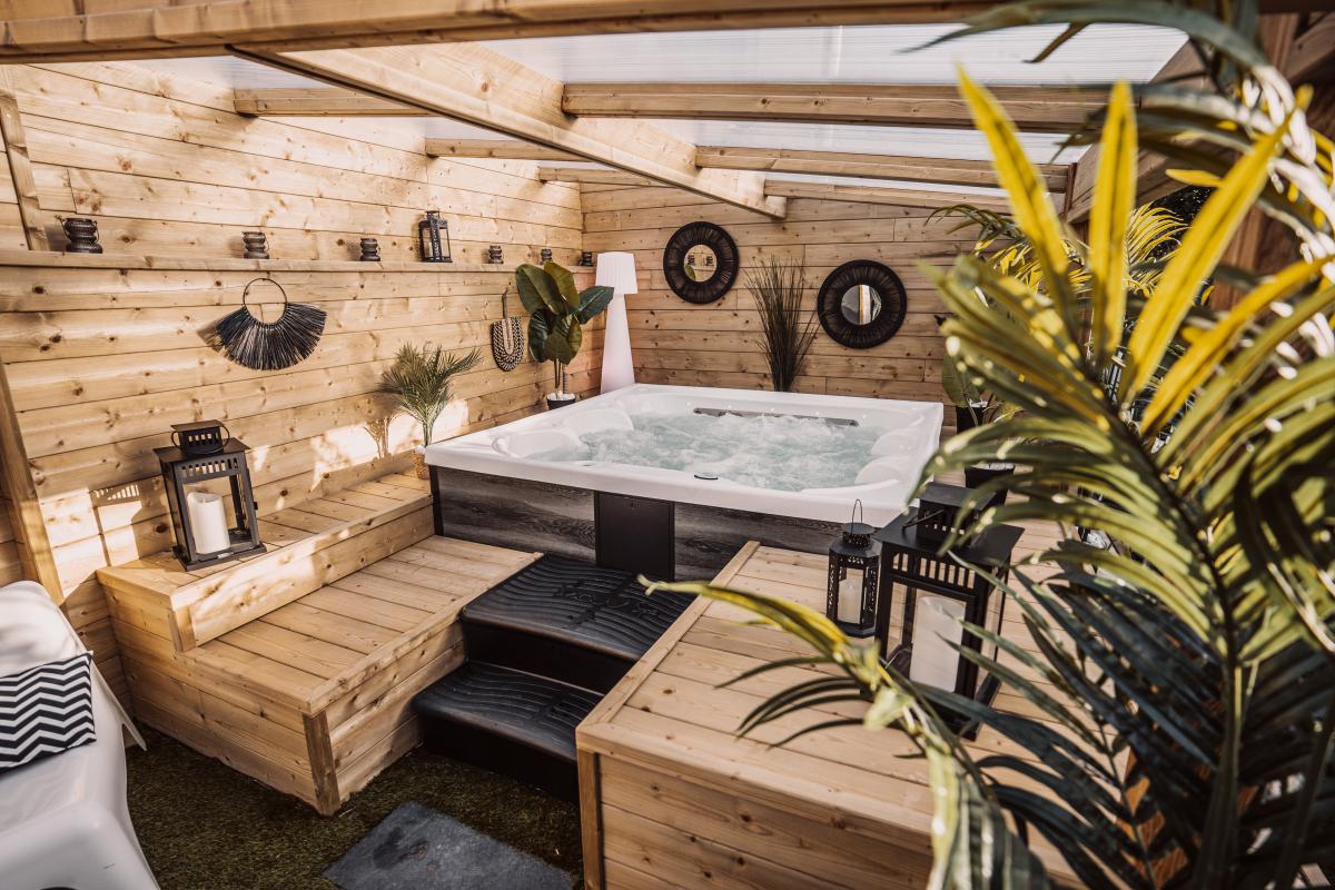 Au rez-de-chaussée, elle se compose d’un espace de vie comprenant une cuisine entièrement aménagée et équipée, ainsi que d’une salle de bain et wc. Cette dernière dispose d’un accès direct vers un jacuzzi situé en extérieur.