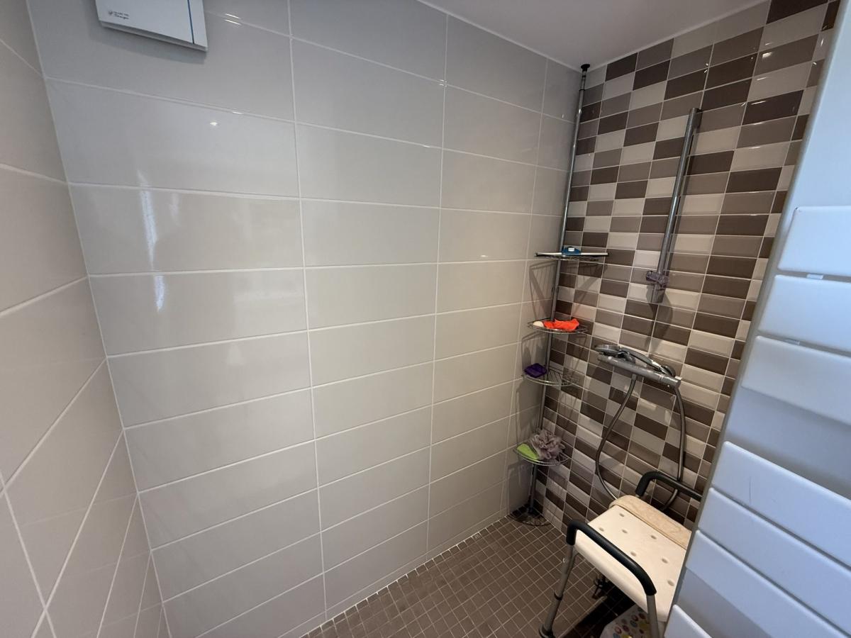 - A l'étage: palier avec coin-bureau, salle de bains avec WC + douche + baignoire, deux chambres dont une avec placards.