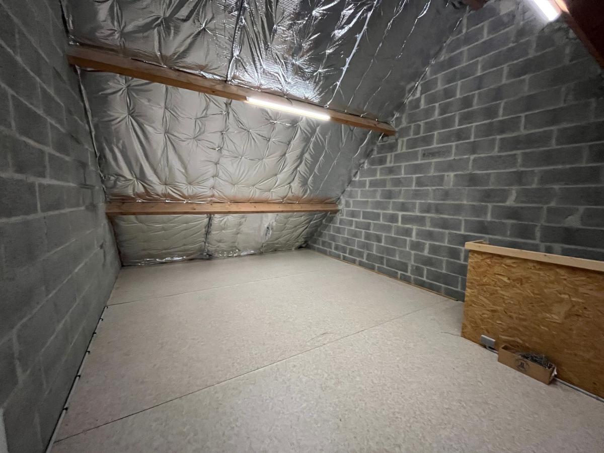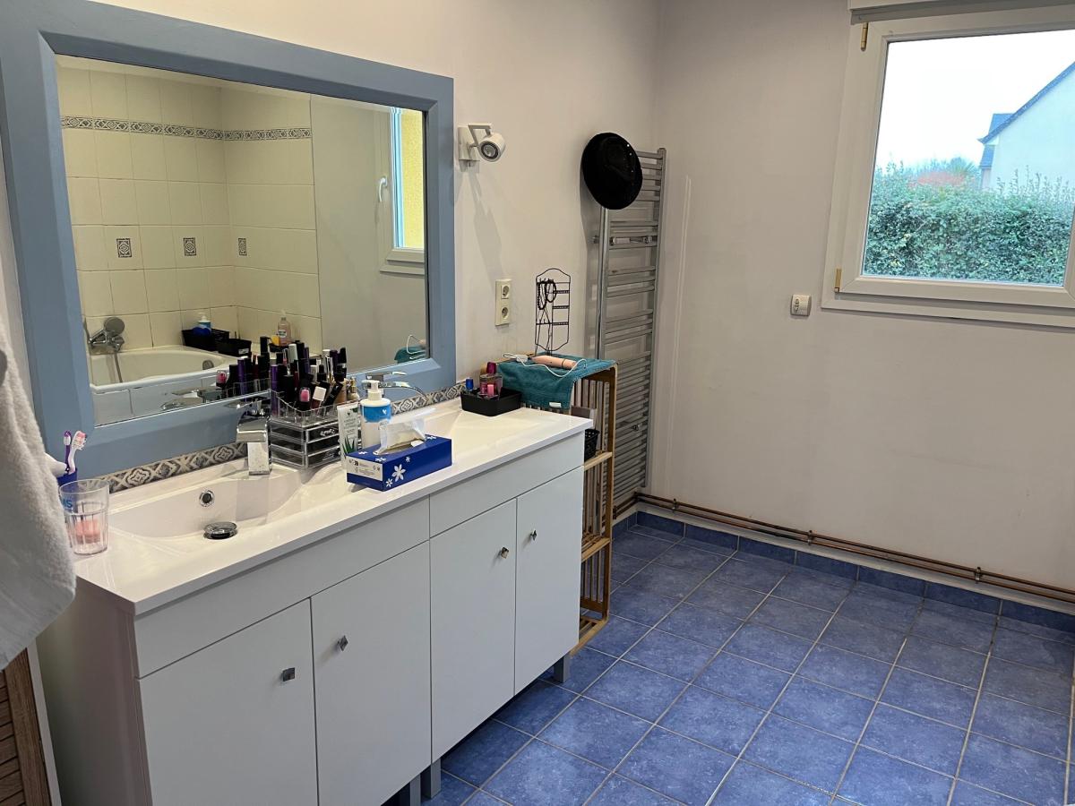 Séjour avec cuisine ouverte équipée (éléments hauts et bas, plaque de cuisson, hotte, réfrigérateur, lave vaisselle) et poêle à granulés 52 m², arrière cuisine / buanderie, deux chambres dont une avec salle de douches attenante, salle de bains, wc,