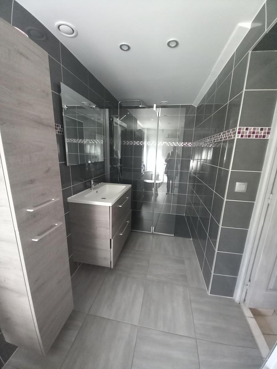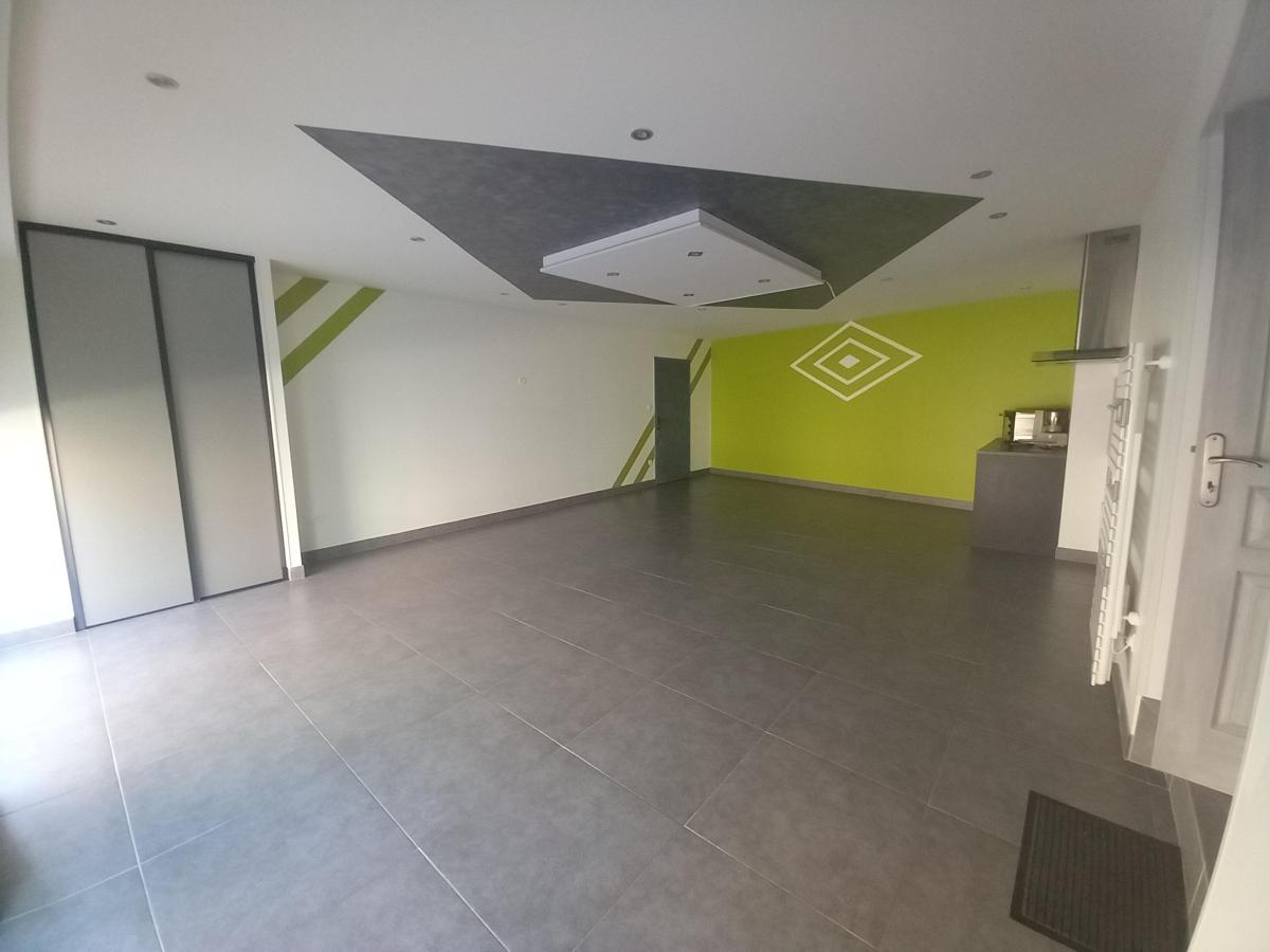 Maison de ville rénovée comprenant RDC : cuisine aménagée avec espace repas (34 m²) - autre pièce attenante à usage de salon ou salle à manger (42 m²) - salle d'eau avec WC. Etage : deux chambres dont une avec salle d'eau et WC - bureau -Grenier au dessus. Cave. Garage avec grenier. Chauffage central gaz de ville. Menuiseries PVC, porte garage motorisée. Tout à l'égout.