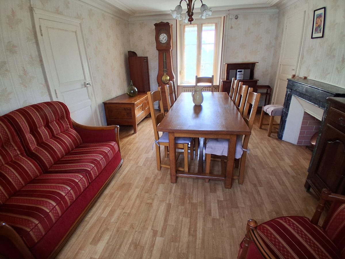 Maison située dans bourg avec commerces et écoles, comprenant : RDC : entrée - cuisine - arrière cuisine - séjour ; Etage : palier - deux chambres dont une avec salle d'eau - Cabinet de toilette avec WC - Grenier au dessus pouvant être aménagé. Cave en sous-sol. Chaufferie en appentis. Garage. Cour et jardin d'agrément. L'ensemble pour 2335 m². Tout à l'égout. Menuiseries PVC.