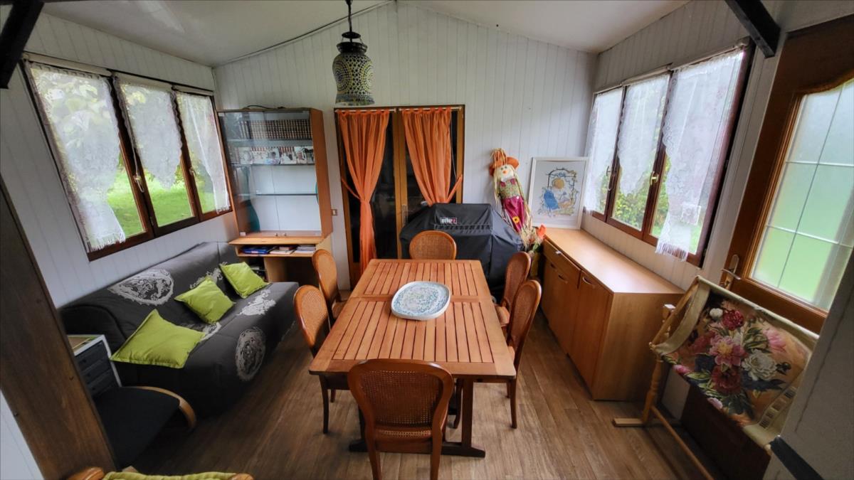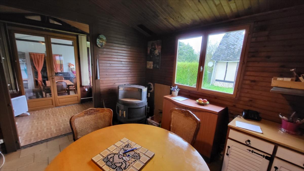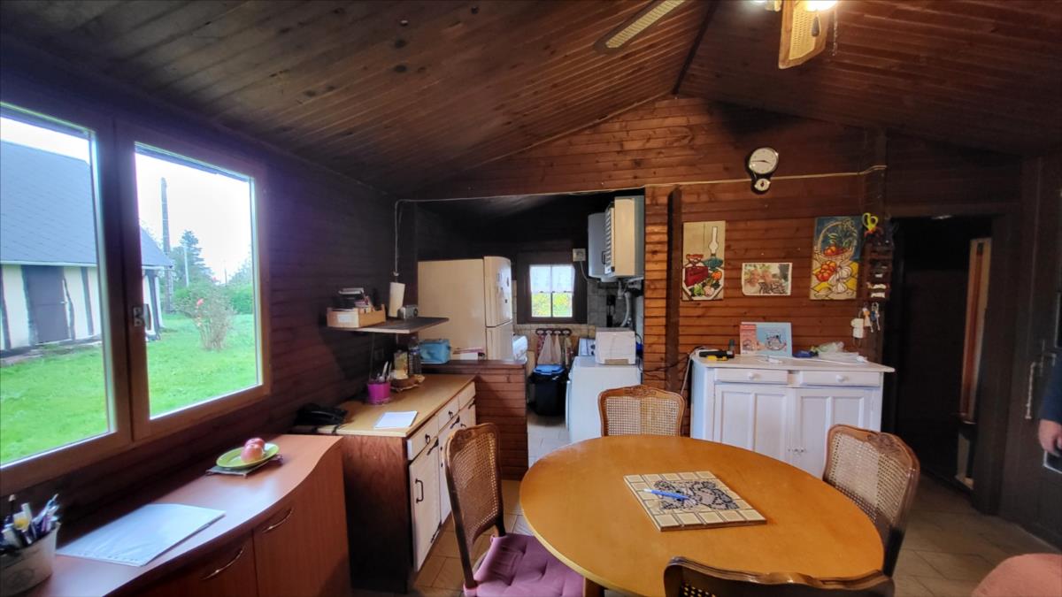 1/ Chalet en bois comprenant séjour avec poêle à bois, salle à manger, une chambre, salle de douche, wc2/ Grange en colombage comprenant cuisine, salle de douche avec wc, bureau3/ Garage en bois,le tout sur un terrain plat de 5086 m², en campagne au calme.