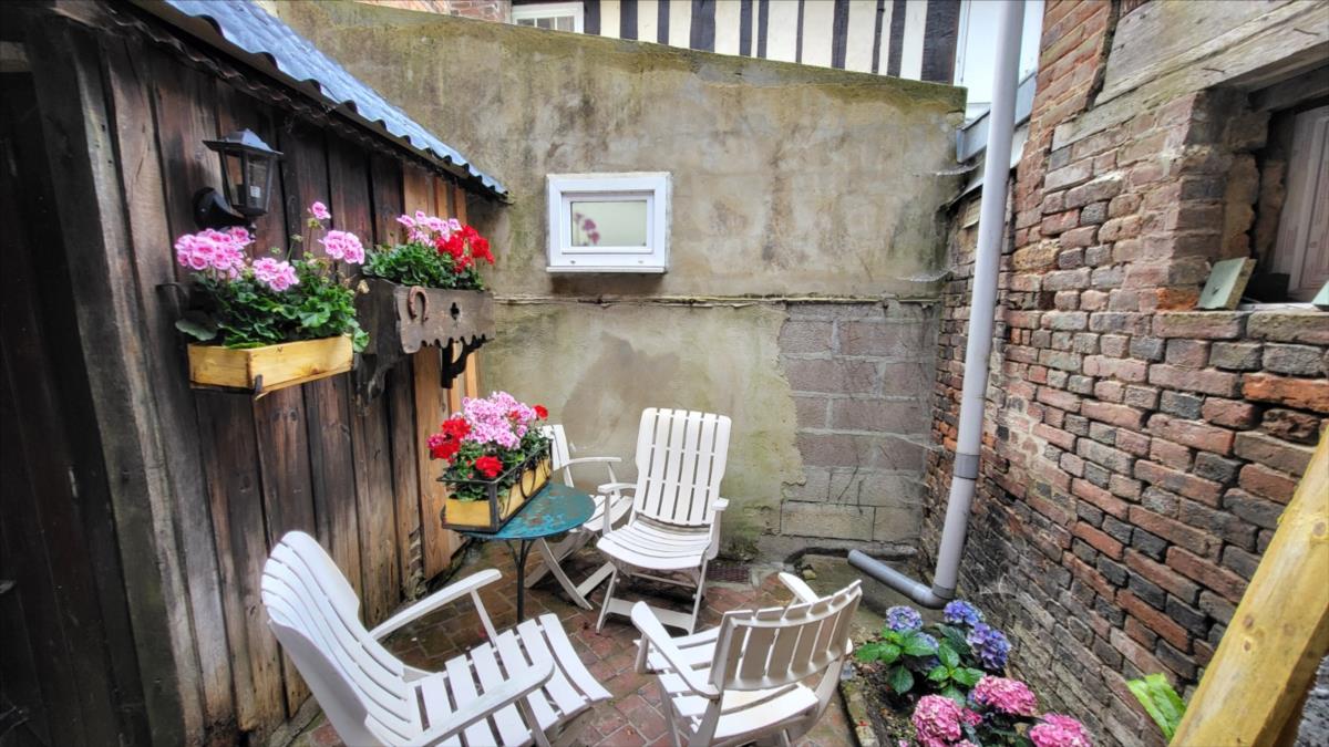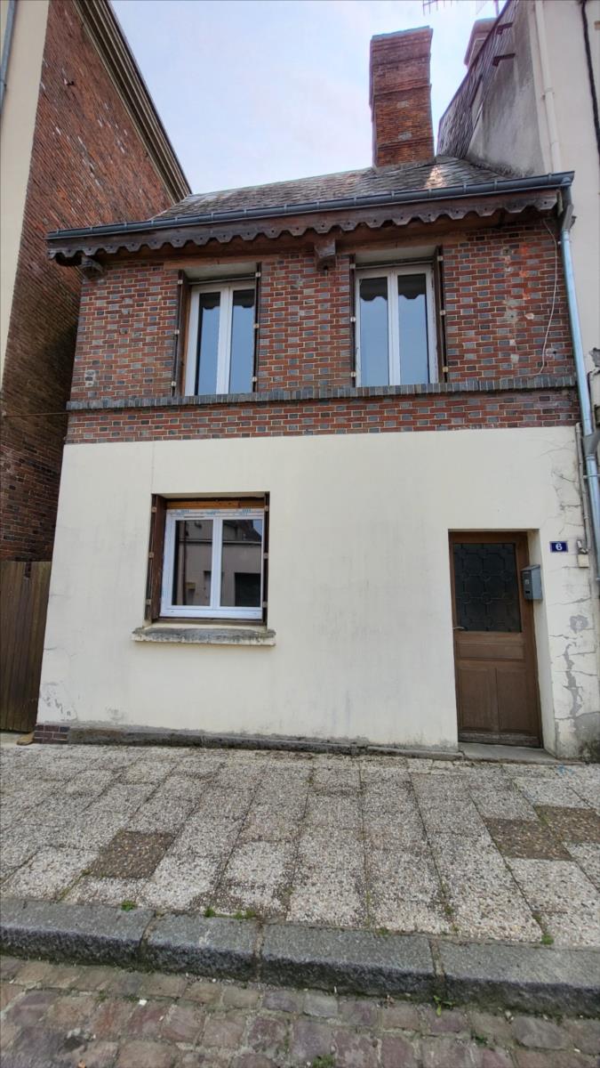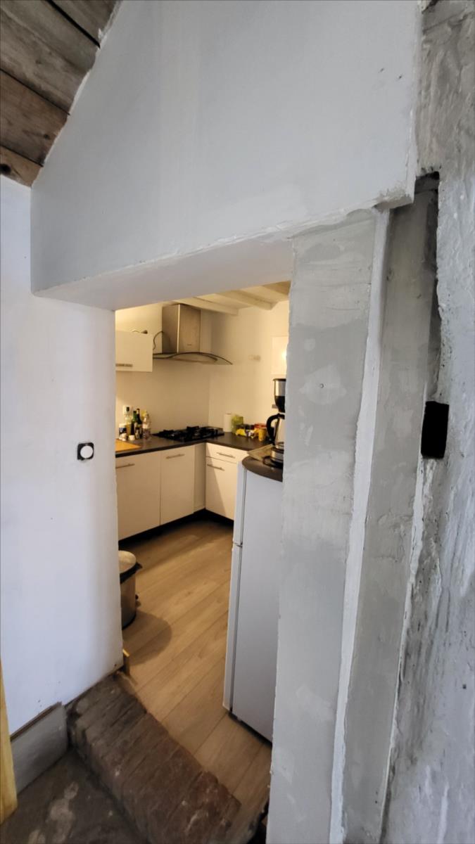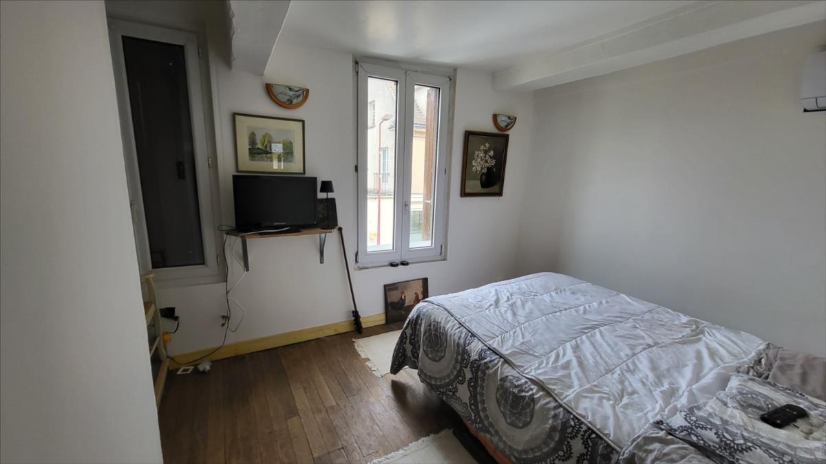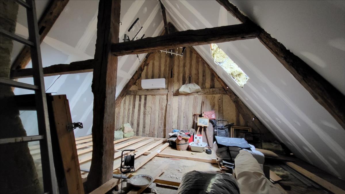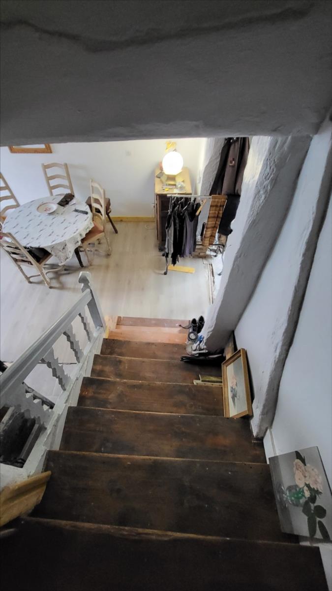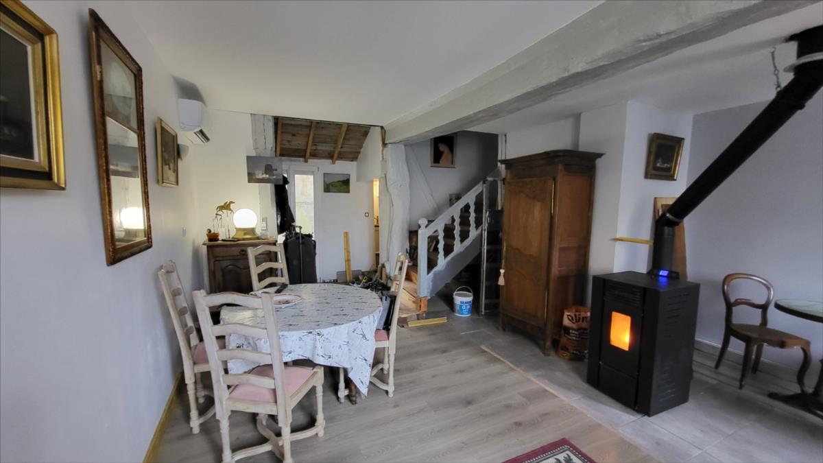 Maison mitoyenne rénovée : Entrée avec poêle à granulés ouvert sur séjour avec escalier ancien, petite cuisine aménagée; au 1er étage : petit palier desservant une chambre avec salle de bains et wc privatifs avec pompe à chaleur air/air ; au 2ème étage : une chambre mandardée à finir (arrivée d'eau, et électricité). Les informations sur les risques auxquels ce bien est exposé sont disponibles sur le site Géorisques : www. georisques. gouv. fr