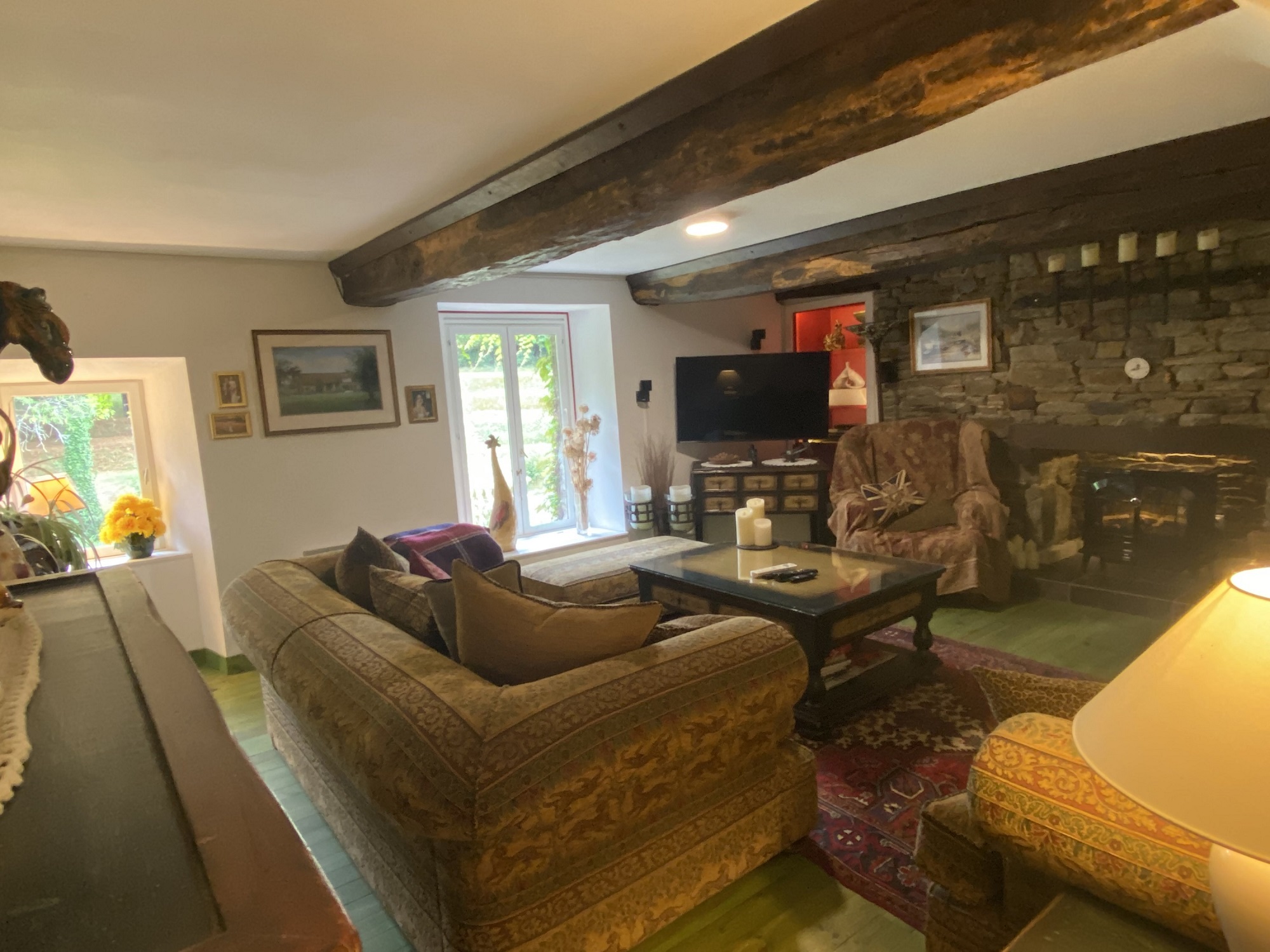 - Salon (4,61 m x 5,12 m) – avec cheminée décorative équipée d’un poêle à bois, pierres et poutres apparentes, deux fenêtres donnant sur le jardin et un radiateur électrique. Le réfrigérateur/congélateur n’est pas inclus dans la vente.