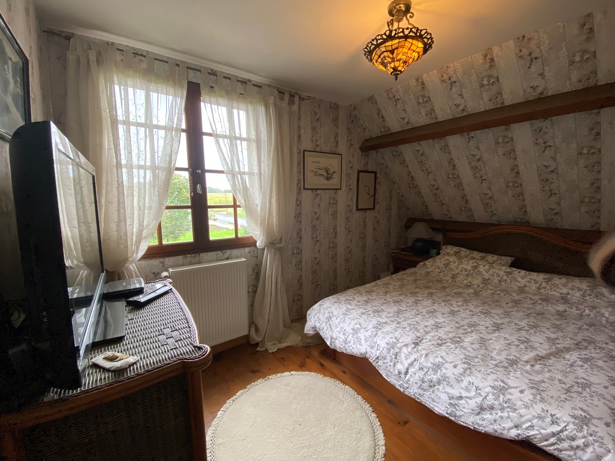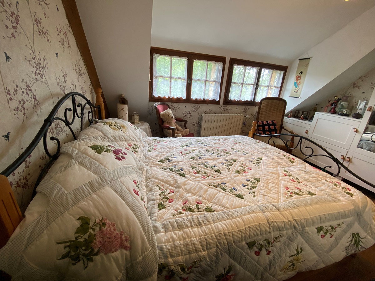 - Chambre parentale d’environ 20 m², avec fenêtre en bois donnant sur le côté de la maison, parquet au sol, radiateur