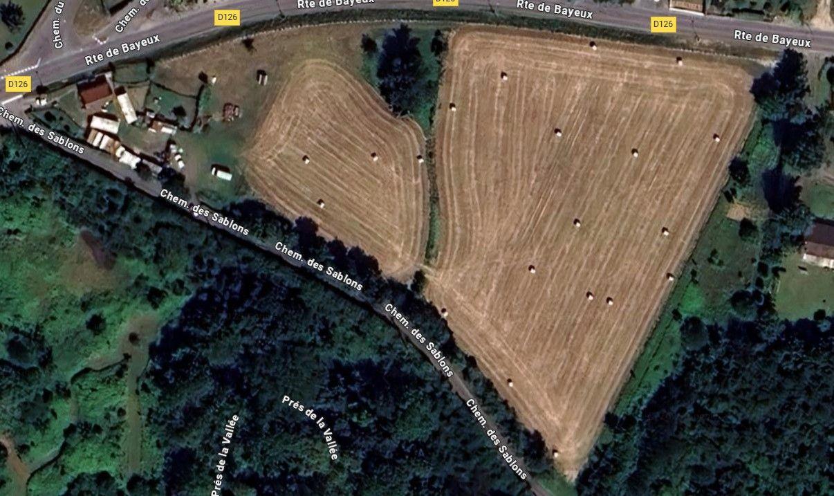EXCLUSIVITE - ESQUAY SUR SEULLES - TERRES AGRICOLES ET MAISON T2 Parcelle cadastrale de 1ha 29a 23ca, sur laquelle se trouve uns maison T2 comprenant: Une pièce de vie, une chambre, une salle d'eau et W.C Partie constructible d'environ 700 m².