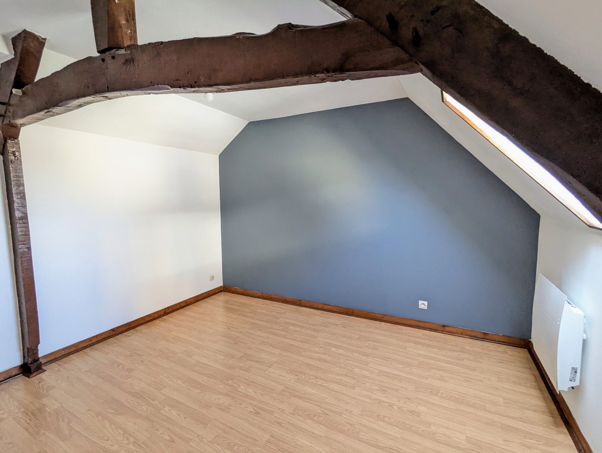 Le premier logement, situé au premier étage, est un appartement d'environ 85m². Il se compose d'un spacieux séjour avec cuisine ouverte, d'une salle d'eau, d'un WC séparé et d'un salon avec accès à un petit balcon. À l'étage supérieur, trois chambres.