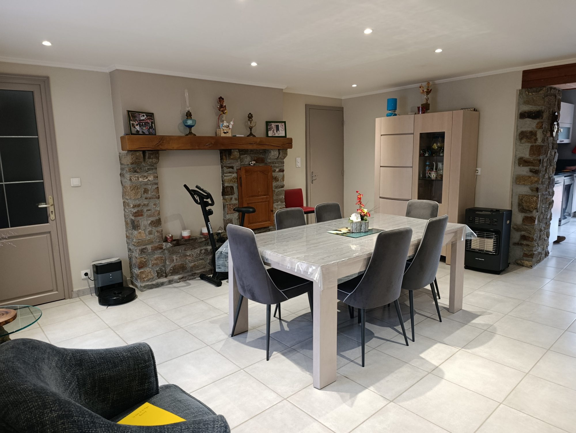 - Au rez-de-chaussée : salle à manger, cuisine aménagée et équipée avec baie vitrée ouvrant sur une terrasse et les extérieurs, un salon, salle d'eau , WC.