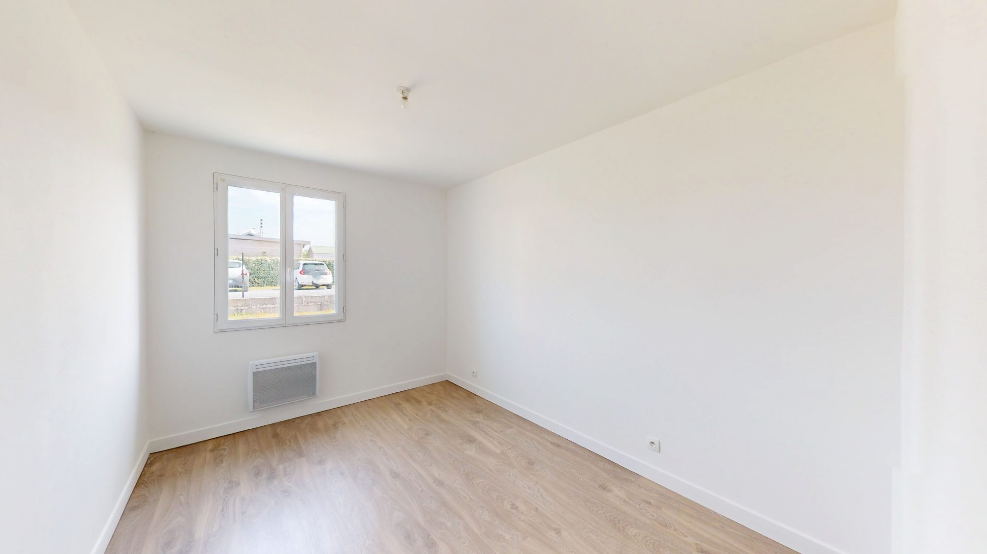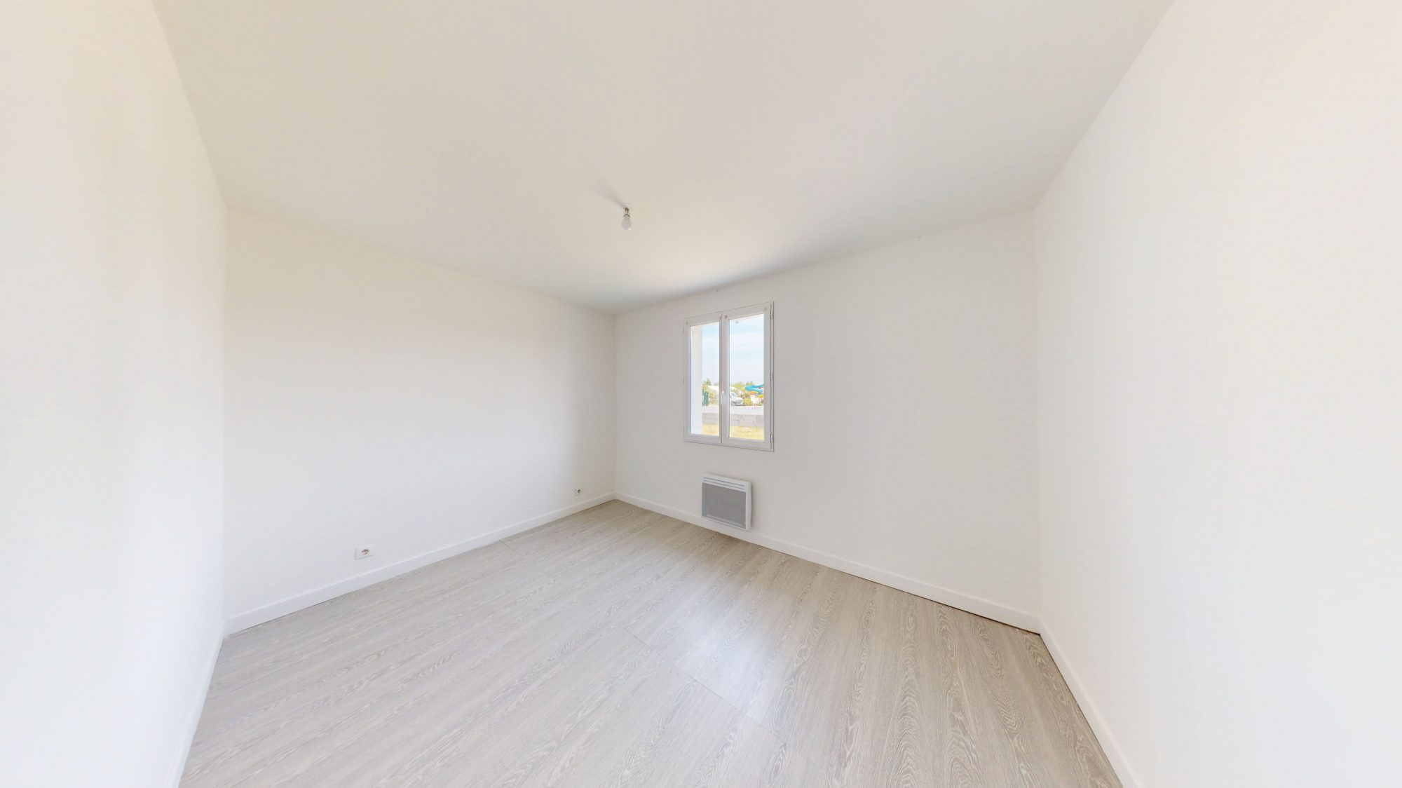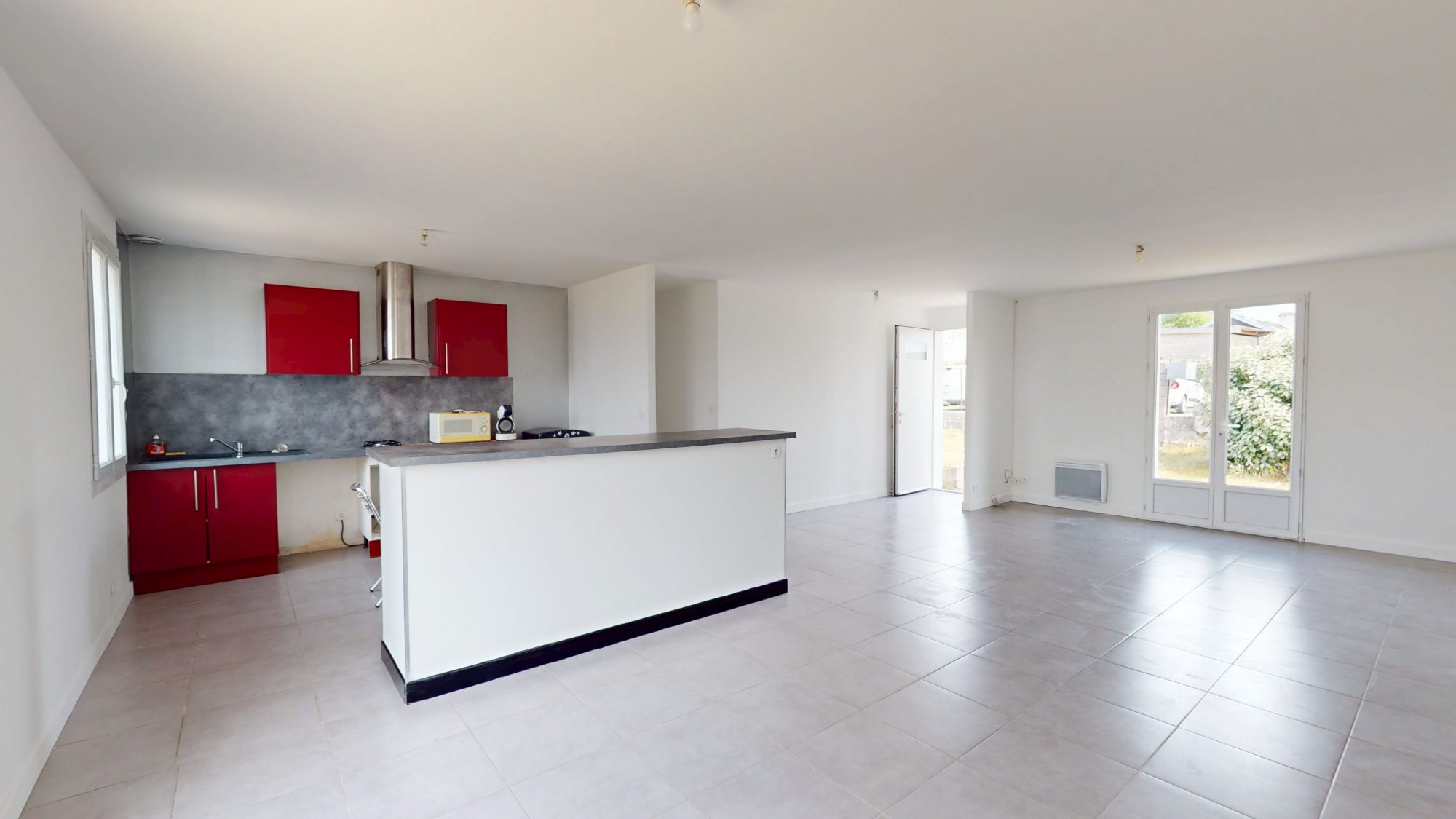 Pièce de vie avec cuisine ouverte, couloir desservant 4 chambres, WC indépendant et salle d'eau.